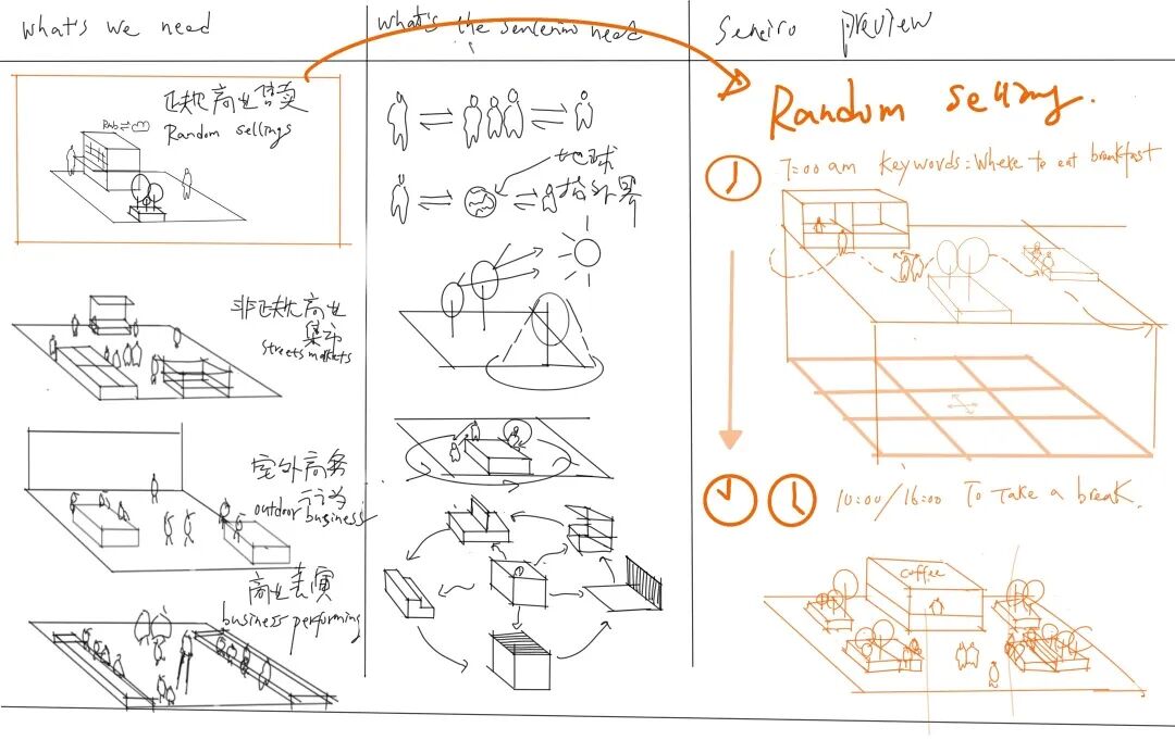 “绿宝魔方”是场地迭代的基本单元,可根据需求升级更替。以售卖模块为例,“售卖魔方”可从存储仓升级为低碳集市。“售卖魔方”1.0仅作为临时储存仓库;2.0拉伸扩容,加入太阳能板,升级为低碳售卖点;3.0延展组合,增加置物台及座椅,可承载更多活动。