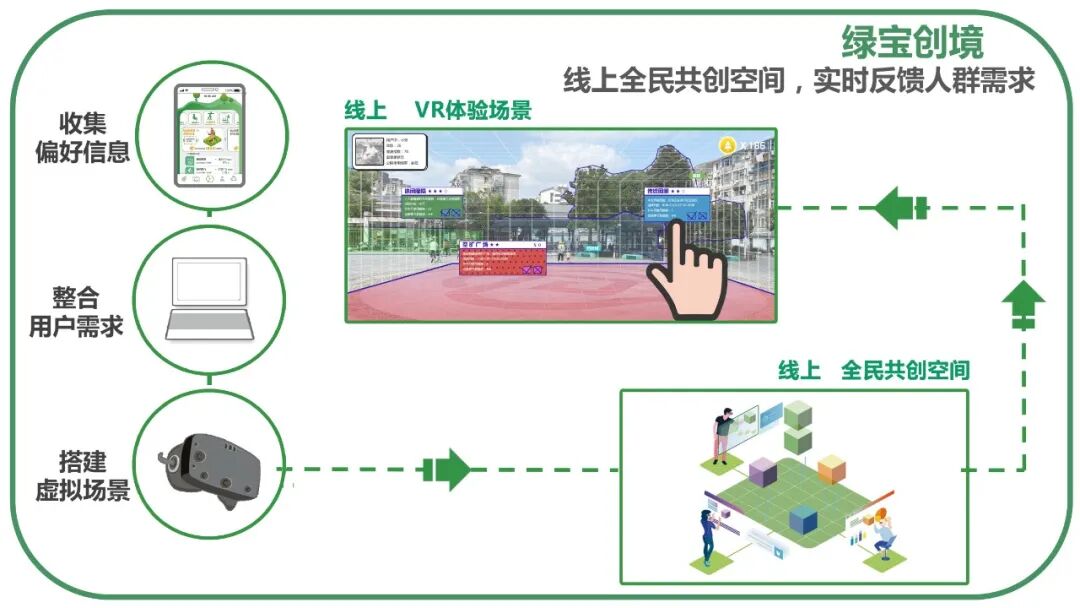 线上“绿宝创境”对公园进行信息化处理,搭建可沉浸式体验的VR场景,让居民共同创作公园的更新方案;
