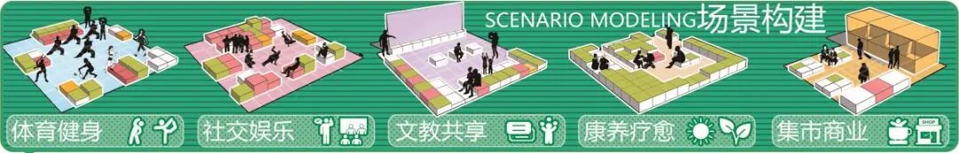 方案让每一位居民均可参与公园模块搭建,实现共创共享。公园可根据居民需求,灵活变动位置、数量,实时更替,演绎不同场景单元。“绿宝魔方”可拆解为便于运输的模块组件,用于同模式公园间的循环利用。通过共创迭代生成文教共享、康养疗愈、体育健身、集市商业、社交娱乐等多元场景,探索公园的多维可能。