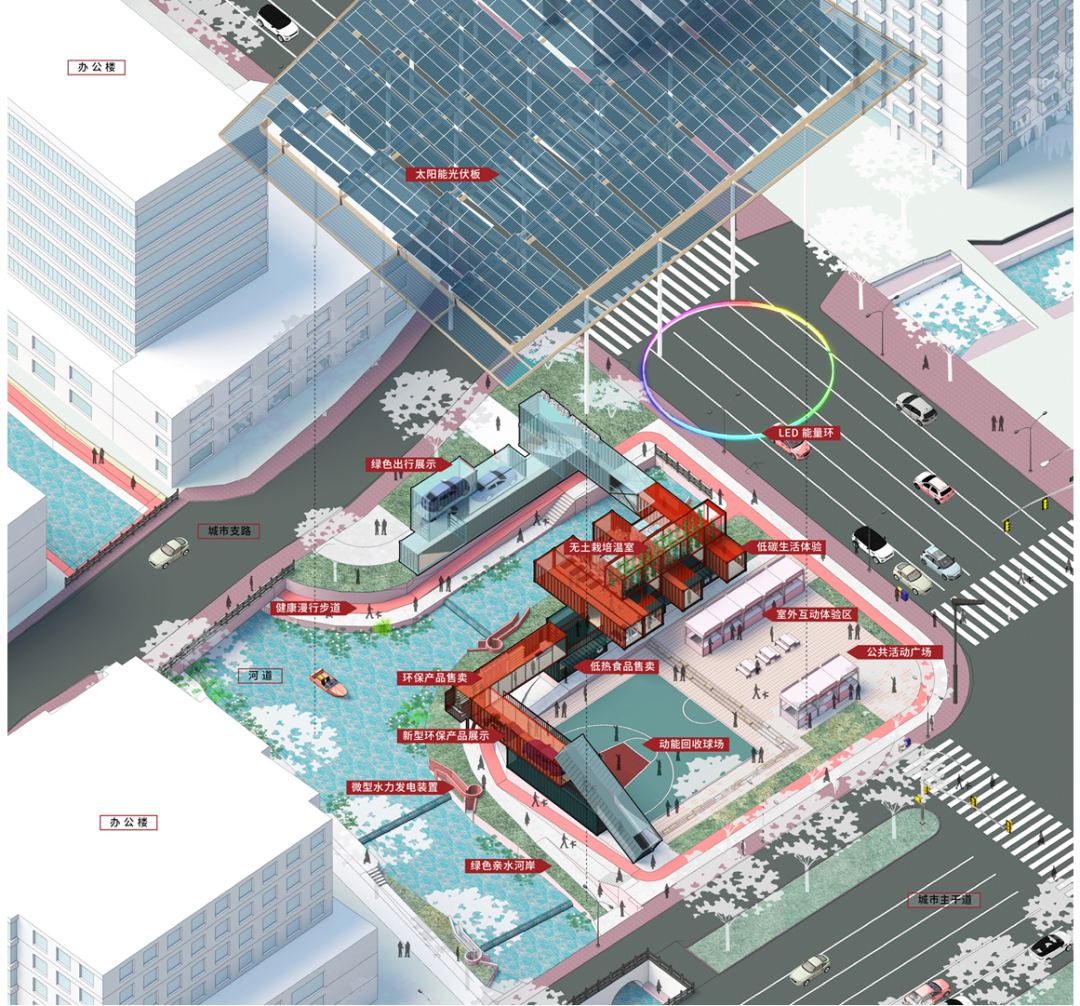 方案通过在空中布设太阳能光伏电池板,在河道里安装微型水力涡轮发电机,实现可再生能源的采集。运用光伏屋顶、回收利用集装箱、使用环保建材,以减少建筑全生命周期的碳排放。