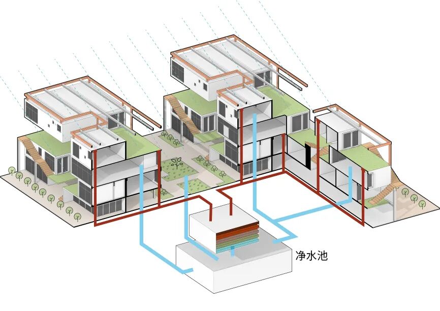 设计采用架空底层和屋顶的方式,促进场地内空气循环。设置净水池收集雨水和生活污水,将其过滤净化后进行二次利用。利用屋顶架空和设置种植层,形成天然保温隔热层,降低建筑能耗。设置太阳能光伏板,将太阳能转化为电能供社区使用。改造升级屋顶空间,构建生态节能系统,实现风热循环和光电循环,助力实现“双碳”目标。