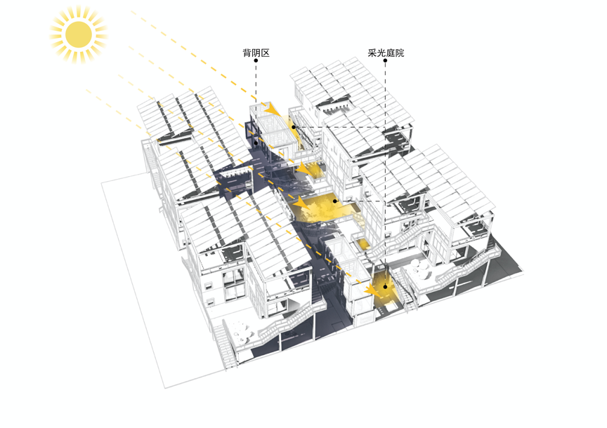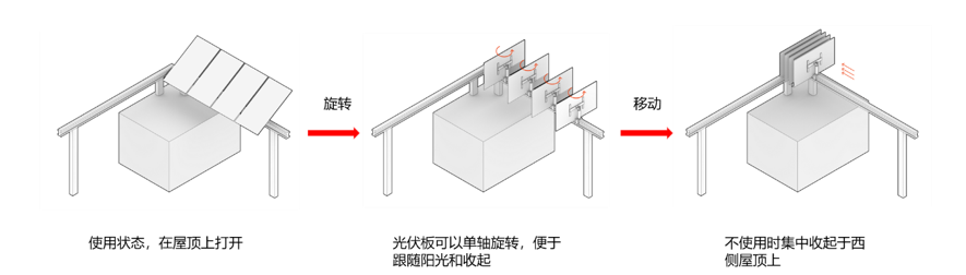 因地制宜增设绿色空间:通过增设太阳能光伏板、尽可能地回收利用场地原有的材料等设计方式,推动零排放、零消耗绿色生活的实现。