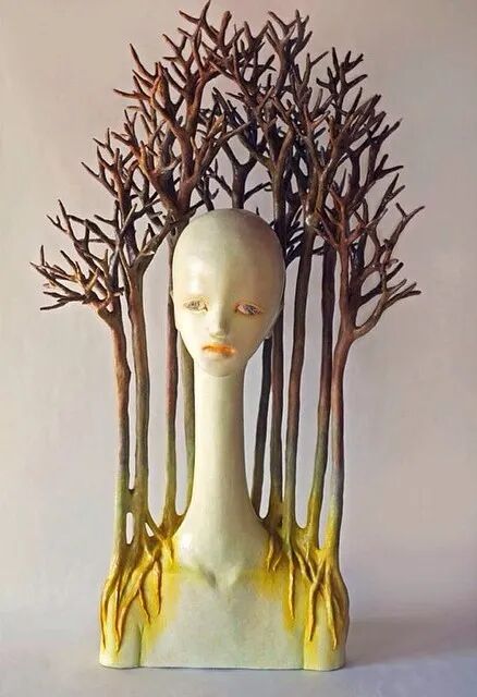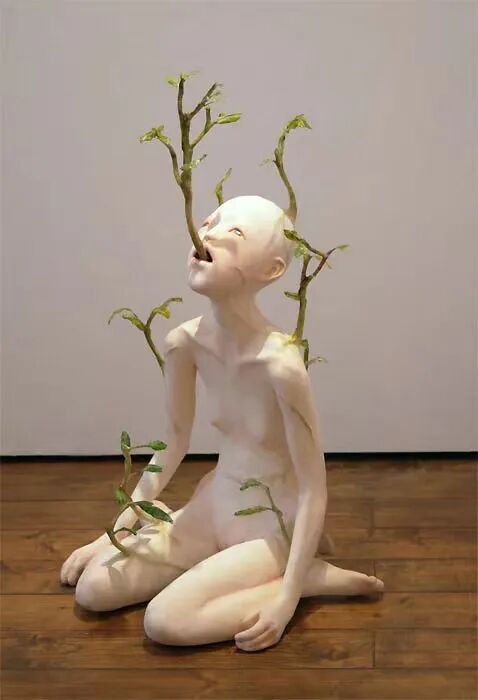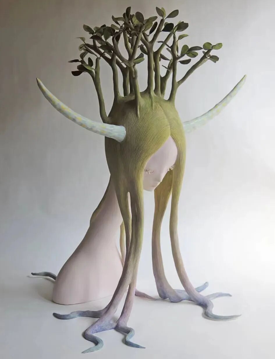 Yui Ishibashi的雕塑既令人不安又宁静,他雕刻的野孩子似乎属于另一个现实领域。苍白、无毛的人物与根和藤蔓融合在一起,通过木材、树脂、粘土、金属丝和油漆的混合物赋予生命。