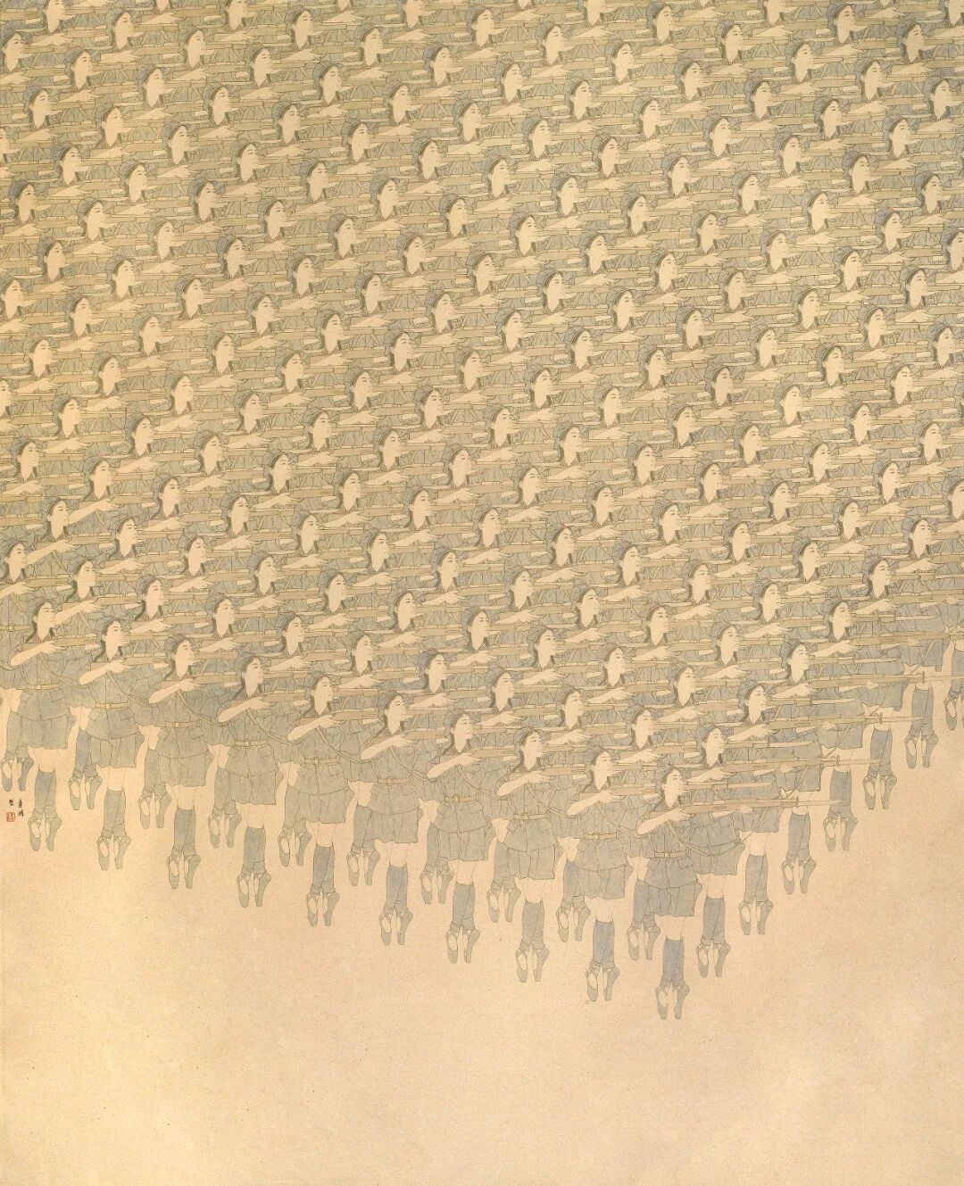 在我们的视觉经验中,大量简单、静止且重复的物体会让我们有一种压迫感,以及这种压迫感所带来的紧张与兴奋。如秦始皇兵马俑的秦军方阵:宏大、威严、气势磅礴,摄人心魄。但在绘画创作中,过多的“重复”令人质疑。它同样违背了绘画的“多变性”原则,被归于装饰、机械、呆板之流。