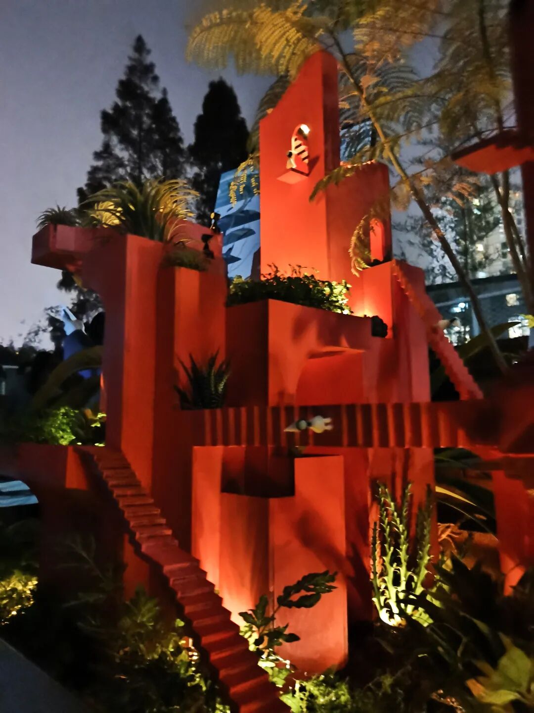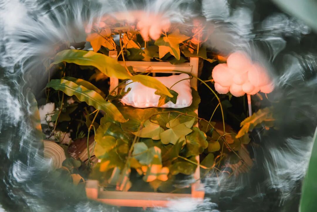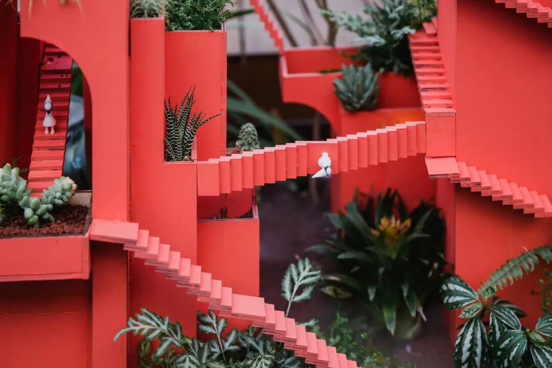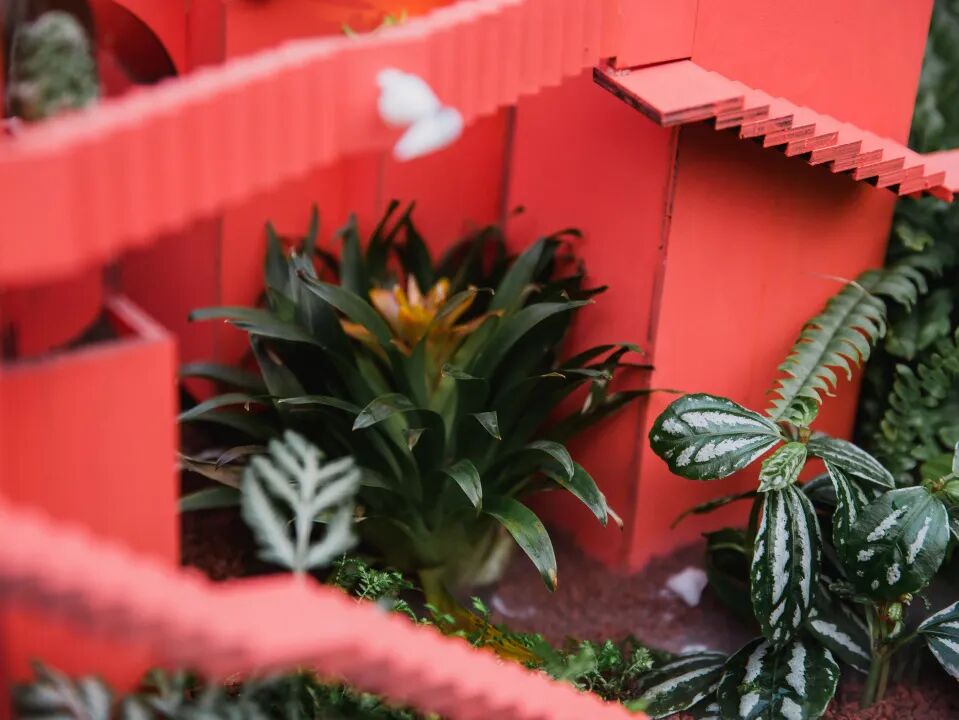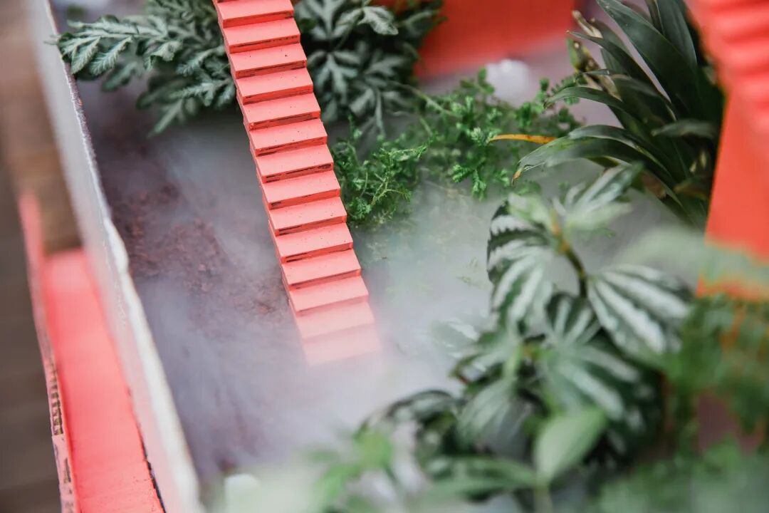 为营造热带雨林的氛围,植物以蕨类观叶植物为主,色彩沉稳,与粉红色的建筑形成对比,像是神秘雨林里偶然出现的城堡。丛林底部用干冰造雾,置身其中如入梦境。