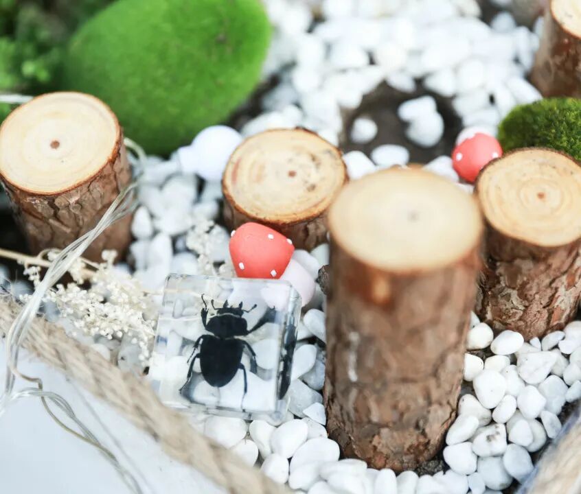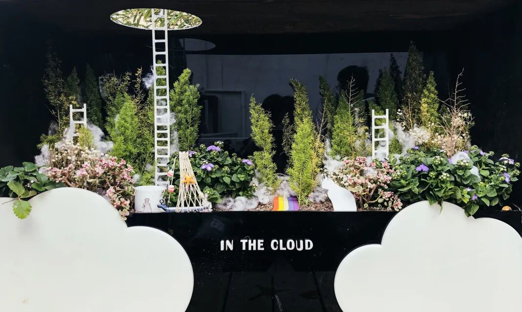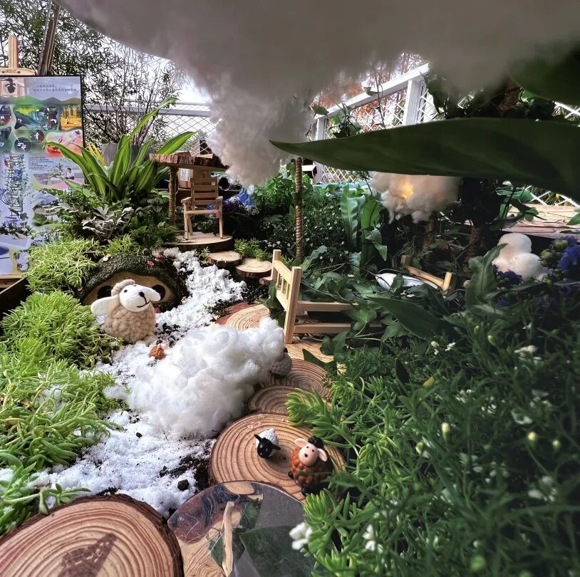 我们希望不仅仅是单纯地用盒子打造场景,更想为每个小孩打造一个心中的梦世界,打破常规盒子的造型形式,将盒子立起来作为礼盒,采用黑色镜面亚克力板作为背景,前面摆放棉花制作的云朵,加上高低错落的植物营造空间氛围感,结合前景的地被植物和纸质人物形成丰富的空间层次,让孩子在自然探险中感受自然的魅力。