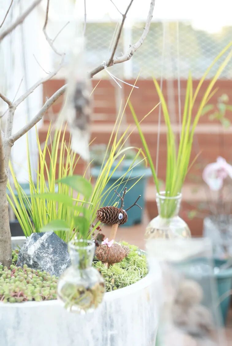 使用植物:乒乓菊 蓝冰柏 长寿花 蕨类植物 黄金柳 仙人球 龙胆花 狐尾天门冬 佛甲草 雾松 星星藓 白发藓