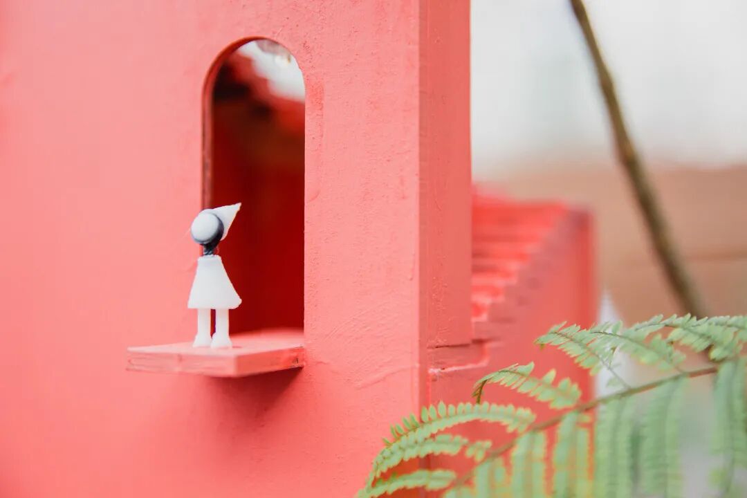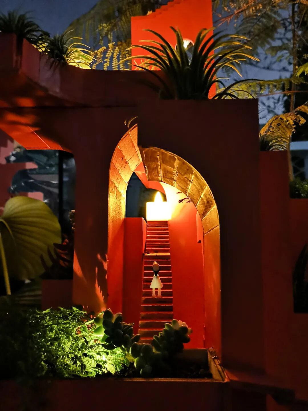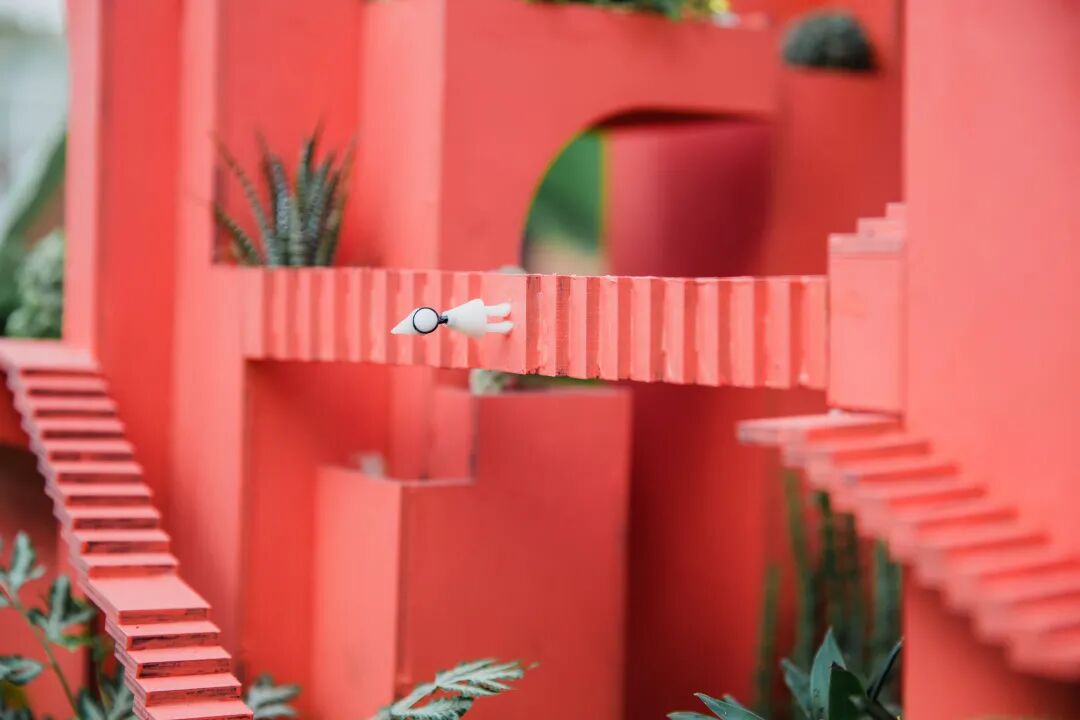我们的主题是雨林中的梦之城堡,设计灵感来自于一款经典游戏——纪念碑谷,模拟游戏里错综复杂的空间结构,搭建一个虚构的世界。设计要在不足一平米的空间内完成,我们首先思考的是如何营造更多竖向变化,甚至突破三维空间的限制,因此我们为建筑设计了很多错综复杂的结构,对局部空间进行旋转和颠倒,形成脱离现实的有趣路径。