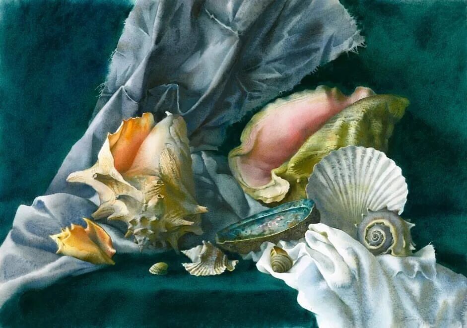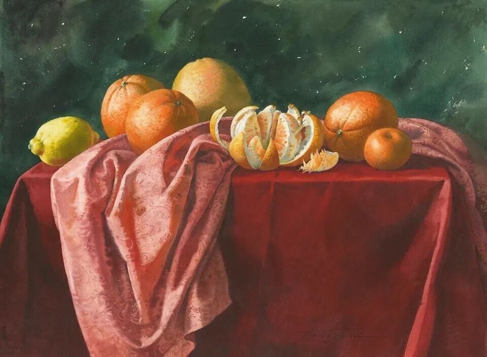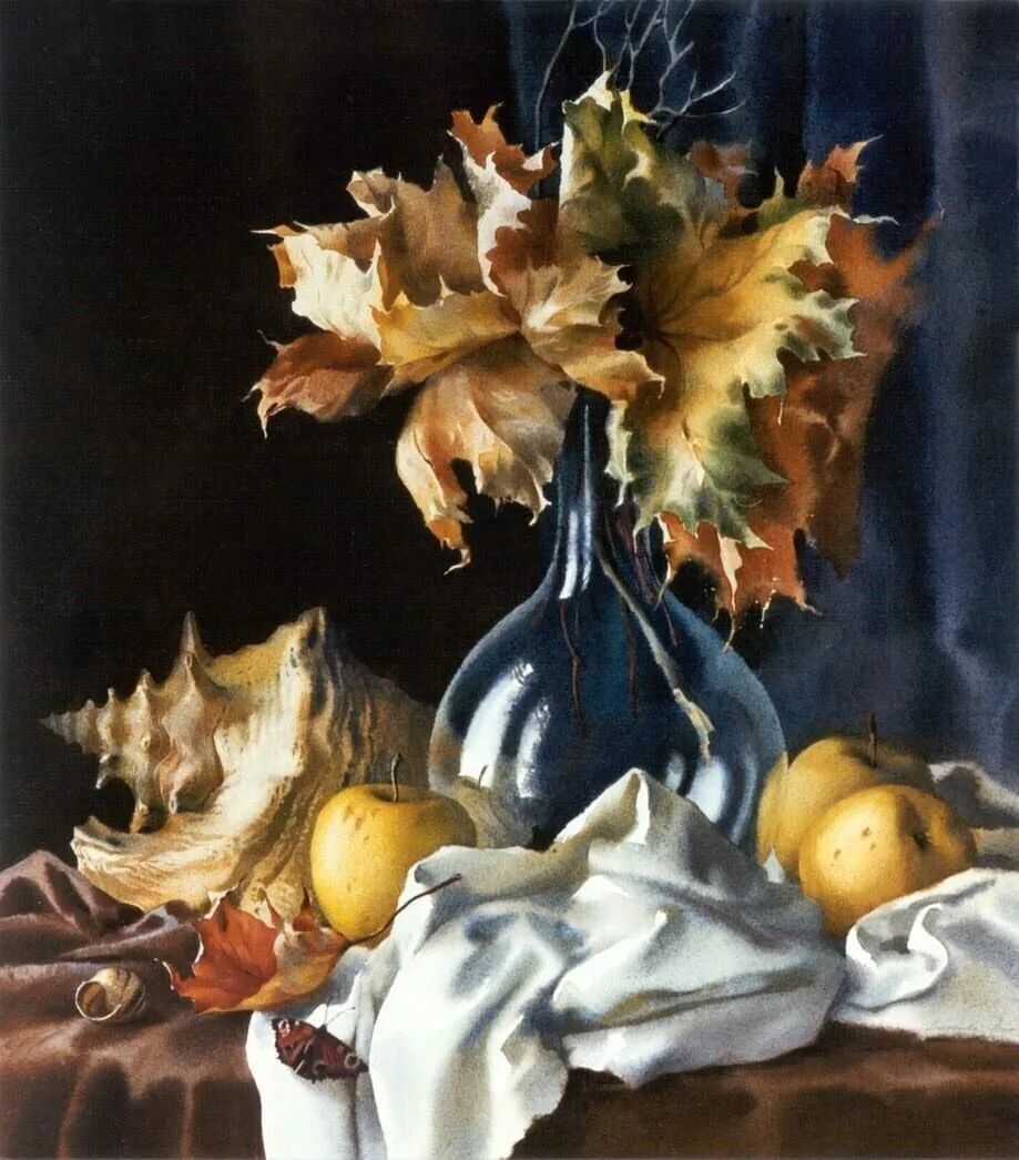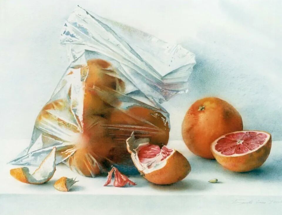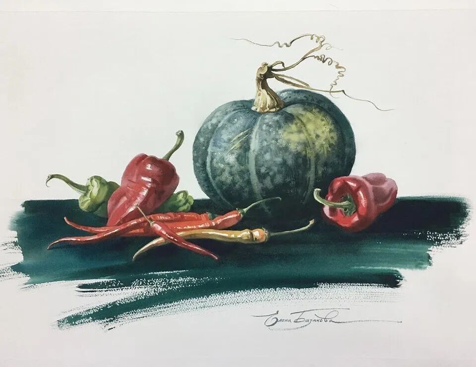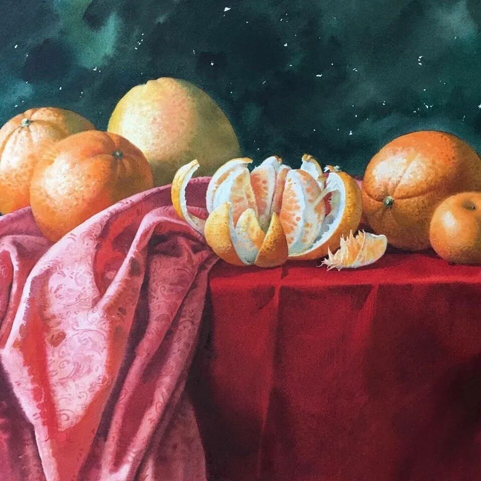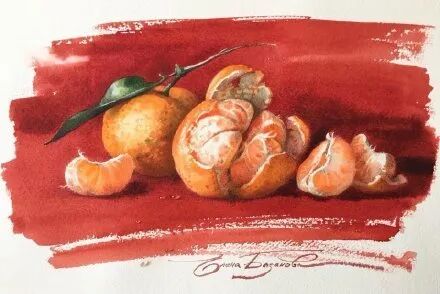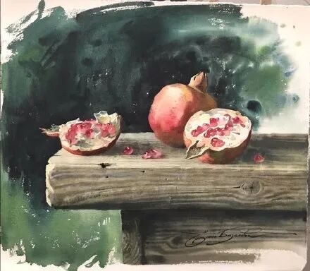 她擅长水彩静物画写生,作画时一般是采取局部湿画法,把画纸放在有机玻璃板上,画板与画纸之间隔一块纱布保持纸的湿度,先从背景入手,刷水打湿,用较浓稠的颜料整体铺背景,然后再通过湿画衔接主体物的边缘,最后刻画细节,虚实得当!