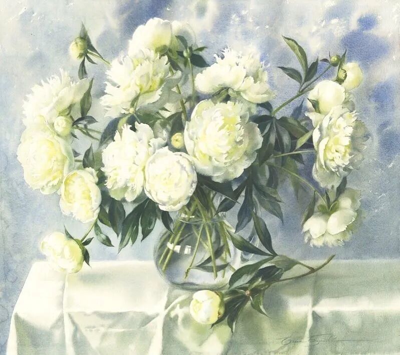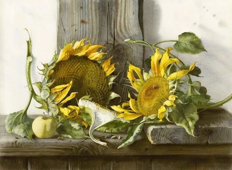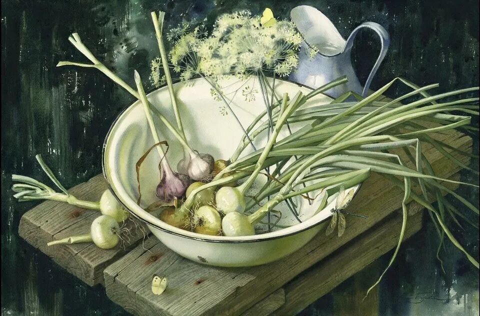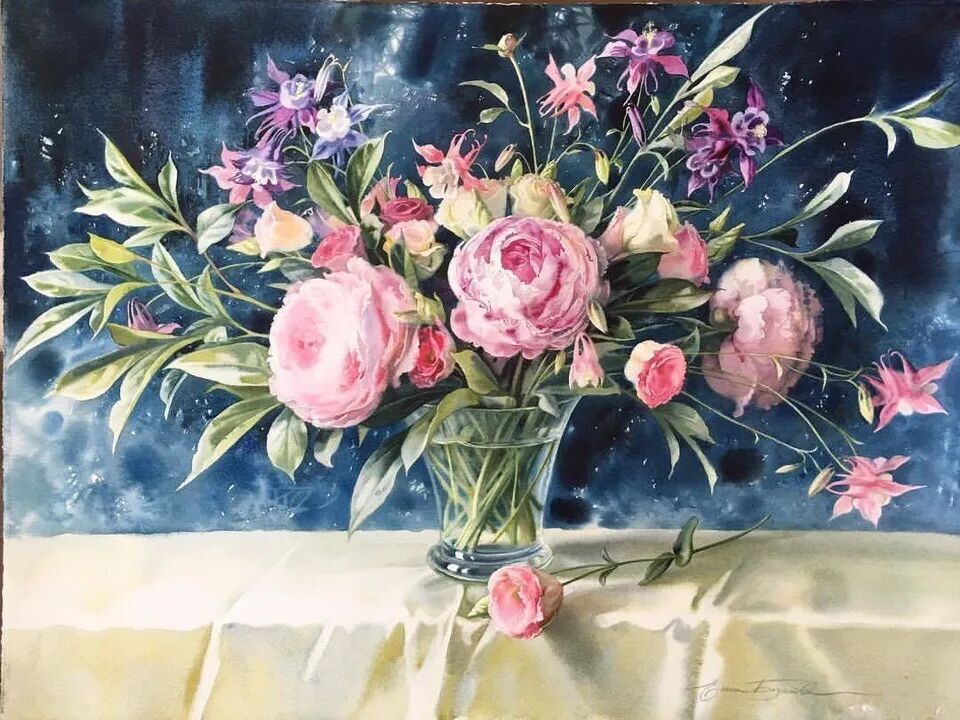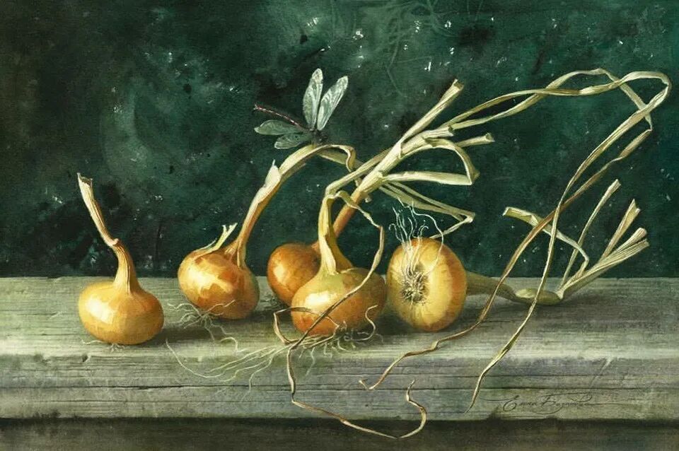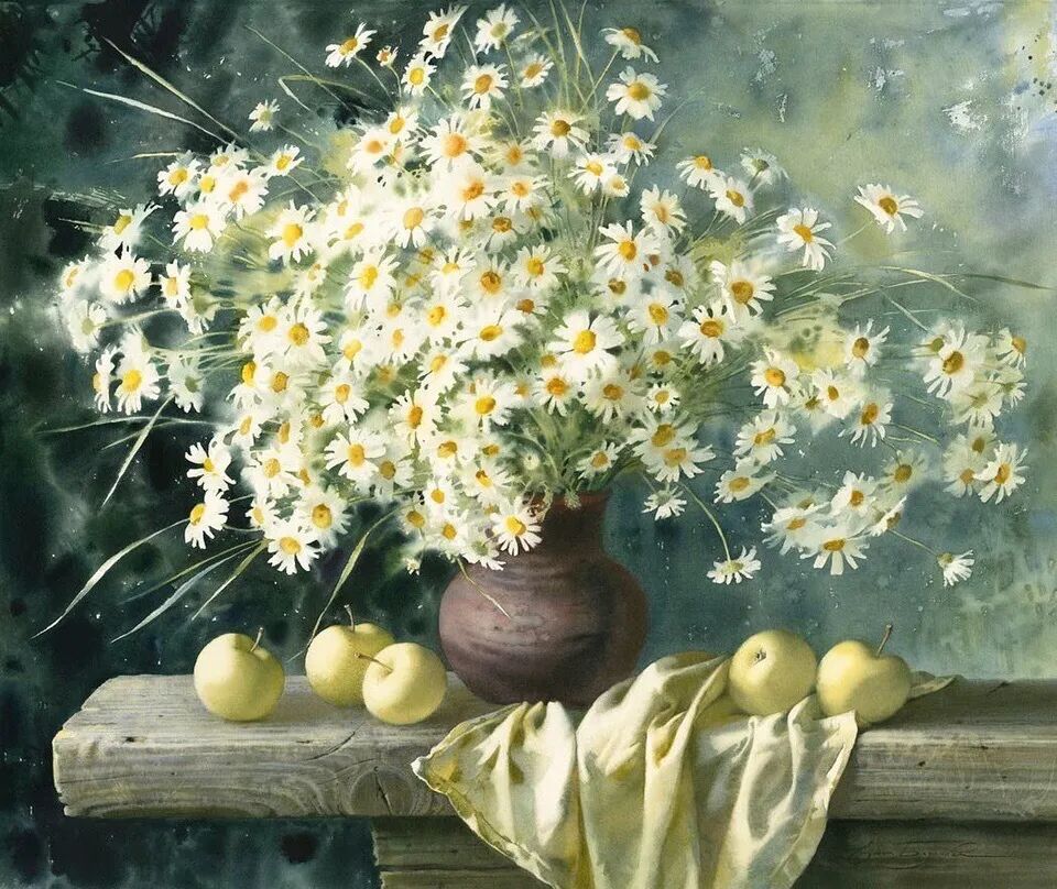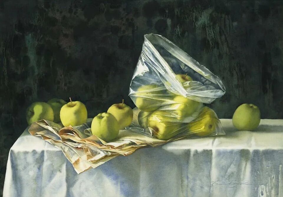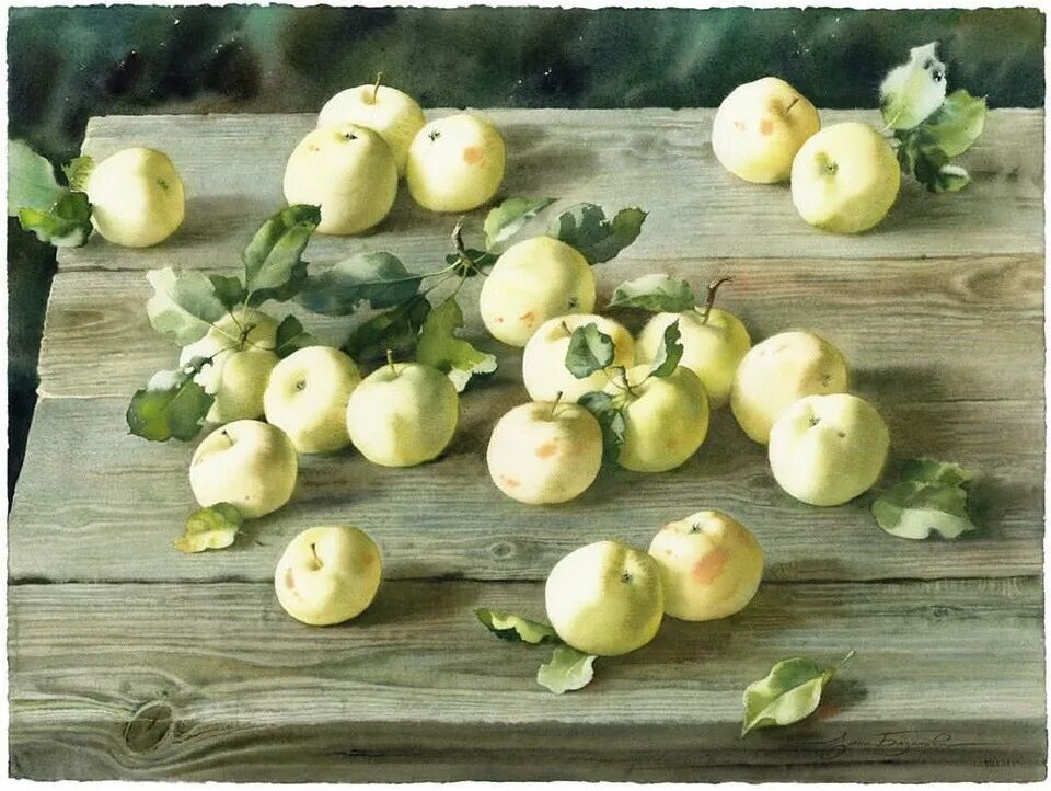 她擅长水彩静物画写生,作画时一般是采取局部湿画法,把画纸放在有机玻璃板上,画板与画纸之间隔一块纱布保持纸的湿度,先从背景入手,刷水打湿,用较浓稠的颜料整体铺背景,然后再通过湿画衔接主体物的边缘,最后刻画细节,虚实得当!