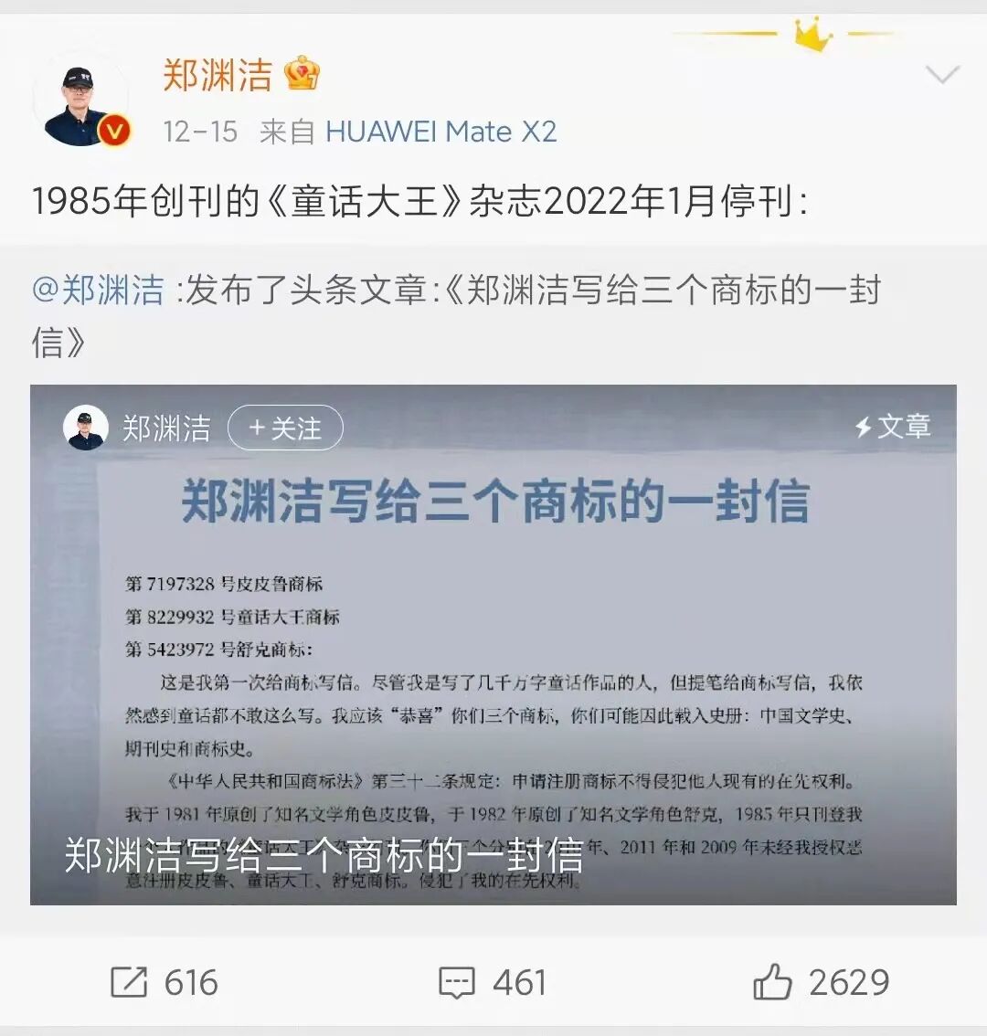 12月15日,郑渊洁在微博发布了一篇文章,并配上文案: