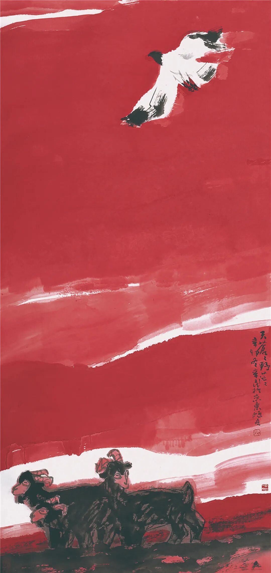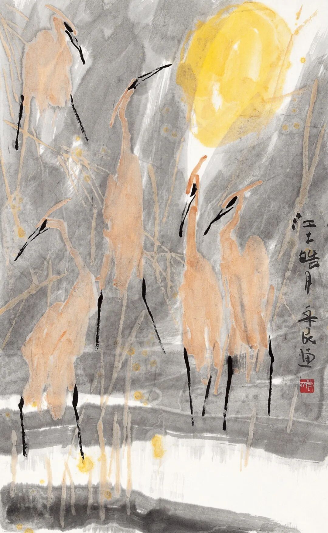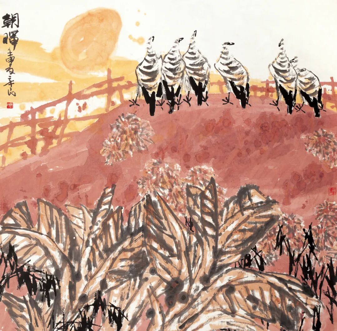 1992 年,他参加中国美协全国首届花鸟画展览获得最高奖的作品《朝晖》,也体现出他在形式创造上的别具匠心。他把花卉景物和群鸟,都作了高度符号化的处理,在画面中反复铺排横向交叠的线条与块面,最终将视觉引向上方的曙光,具有震撼心灵的力量,在当时堪称是开启花鸟画形式表达新风的典范之作。