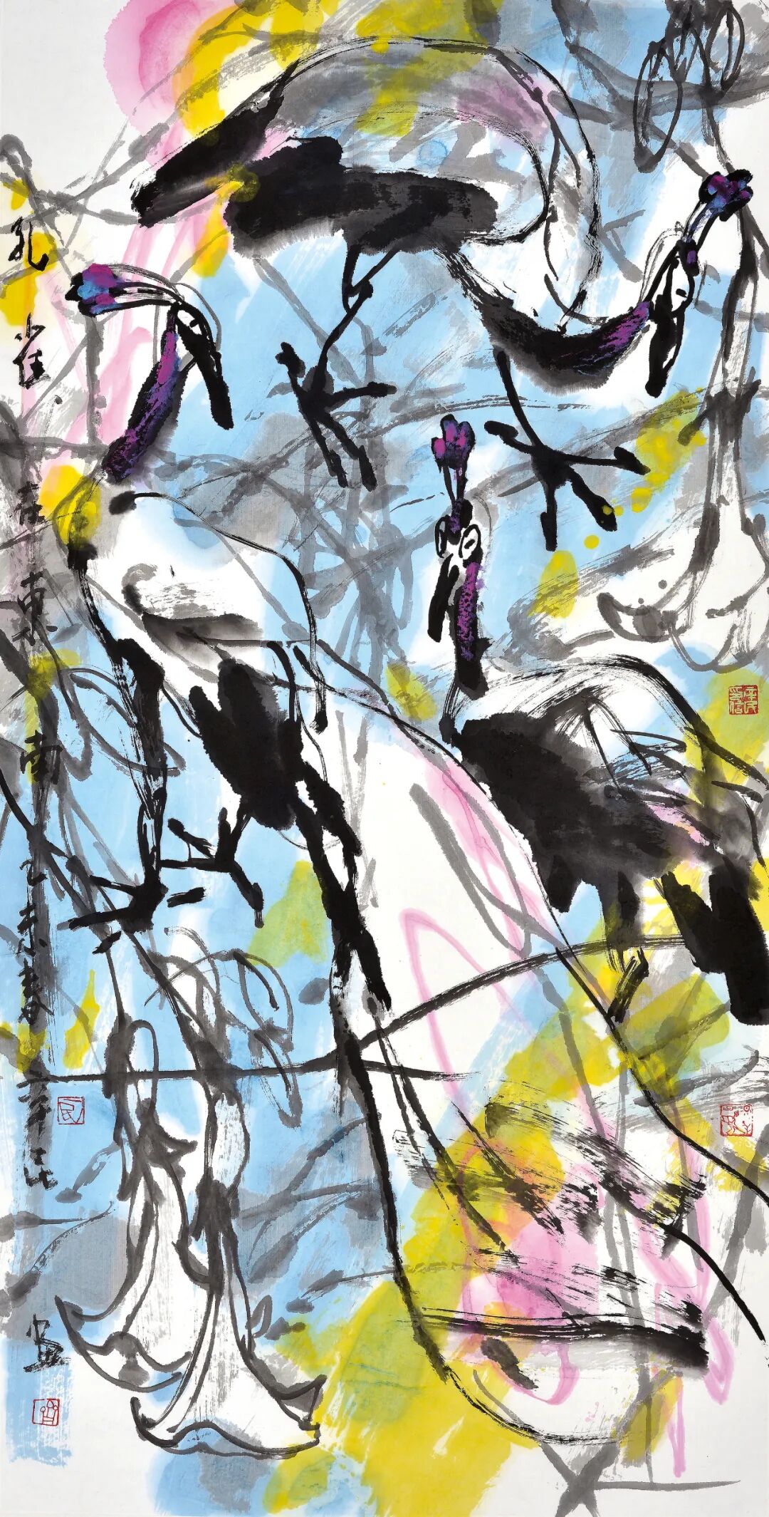 这也体现着他对写意花鸟画现代画风的着力点:在大写意逸笔草草,不求形似的基础上,进一步解脱形的束缚,进一步强化笔墨语言与形式语言的表达,贴近绘画的本体语言。