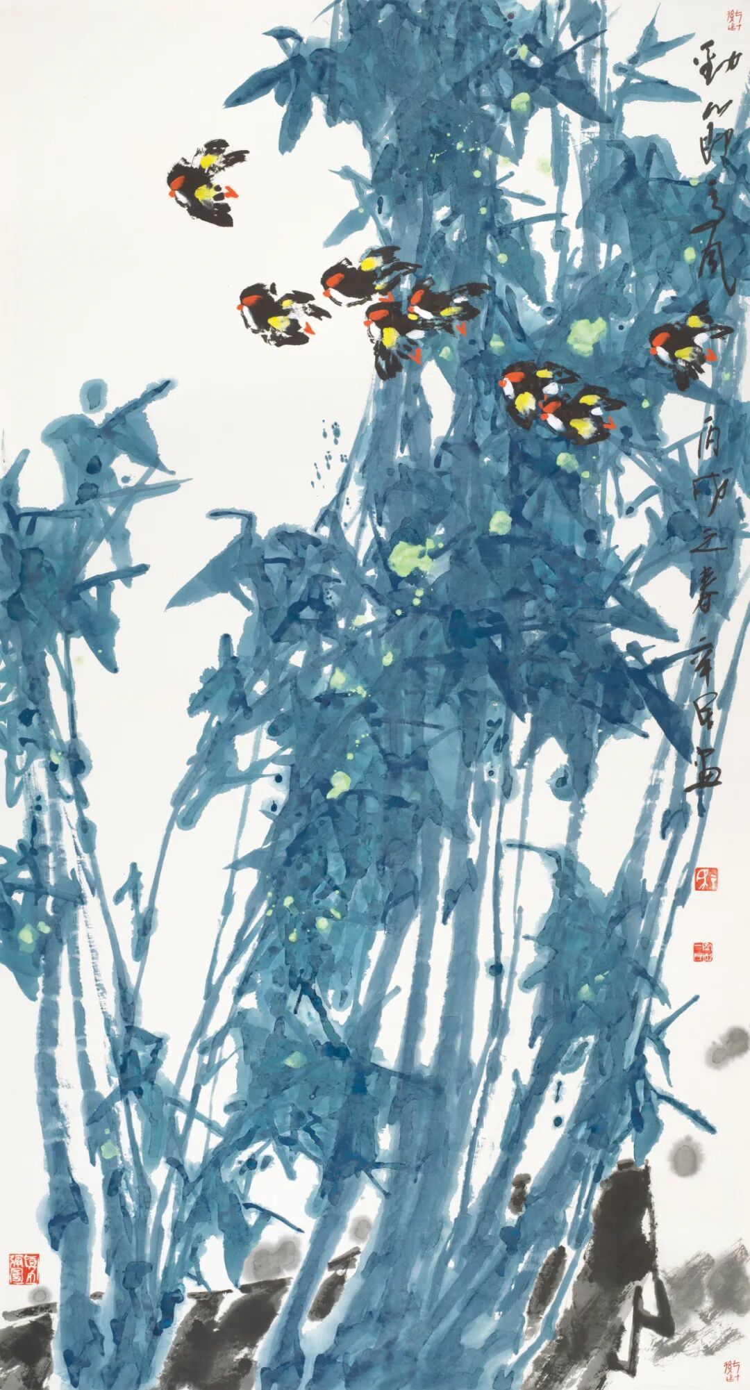 进入1980 年代之后,齐辛民就以许多独特的花鸟形象,而为画坛所熟知,尤其为花鸟画的许多青年后学所追摹。像他画竹子,有时用墨,也有时用蓝色、绿色,竹叶的组合打破了传统中个字、介字等固有的程式,他以阔笔、细笔的随性结合,藏锋、露锋的自如转化,形成了自己的新程式,体现出对笔墨结构的新体验,对形式美的充分融入。