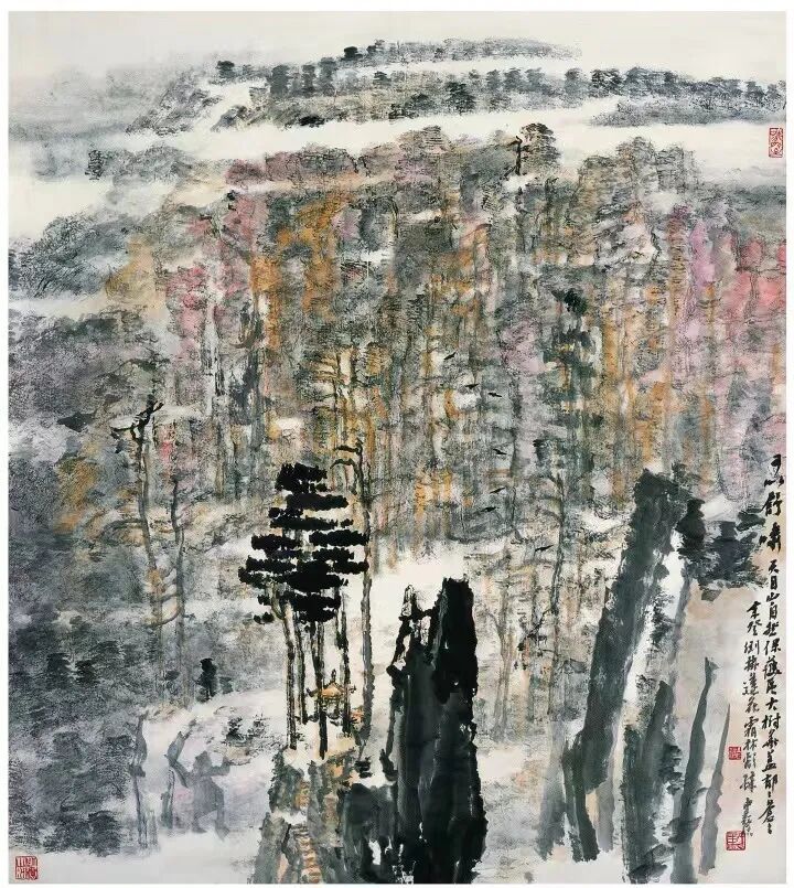 用笔的骨力体现为有“骨意”“骨韵”。同时,“用笔宜活,活能转”,能使笔力在运转中,充分体现墨的丰富的层次变化。如用墨“润”的内涵就是极为灵变的,“秀润”“枯润”“渴润”“松润”等等,不是一味表现一种用墨特性,而是在多样性中,需要时刻考虑到画面整体协调和润。观者看到的是大气磅礴,其实在画面布置、安排时,却是精心细腻的。云气、烟云的处理,要富于诗意氛氲,似扑朔迷离,又清朗峻健。大山大水的风景,逼仄出的白云流风,将自然山水的触目印象,随内心情感的流转成为风起云涌的磅礴气象。具体到笔墨结体时,主峰气势要坚实有力,并带动层叠峰峦的势气连绵走动,这样才构成画面的节奏变化。以传统皴法为基础,以贴合自身心性的笔墨,重组实地景物的结构,也就成为每张画面特有的笔墨结构。