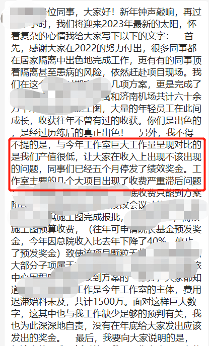 职场圈2024-02-21 TOP3设计院某领导有小金库?围标?还能去TOP2高校办讲座? 大家且看且珍惜。 原创|计成 作者|计成 编辑|计成 不知道能活多久,但是我还是毅然发出来。大家且看且珍惜。 主人公是国资委直属设计院、大佬设计院旗下知名建筑设计工作室主创设计师。 设计院知名到什么地步,大家都尊称一句简称。 主人公能量大到什么地步,大到围标被查,还能去top2高校演讲。 01 年终不发 囤积小金库 新年伊始,主创设计师就在群内洋洋洒洒小作文给大家送温暖和祝福。坦言“与巨大工作量呈现对比的是产值很低”,已经停发了五个月的绩效奖金,并及时画饼,说来年项目充足,奖金无忧。 实际上,该事务所背靠大树,项目无忧的确是真,加班熬夜也是真,唯独绩效是饼。时至今日,该所每月依然只发基本工资。每一个北漂都知道,那点钱,连每个月房租都付不起,员工已经正儿八经贴钱上班长达半年之久。 明眼人都知道,设计院乃按成果付款,工作量即对应产值,从来不存在负相关的可能性。而所里发不出钱来,还是不想发出钱来? 据其员工爆料: 02 大胆违建 与2hui住所一墙之隔 与此同时,此人的工作室在居民楼一楼,乃是居住建筑违规作为办公属性使用。同时还打通了该居民楼的一层,还在山墙面开门,属于私自改造楼本体。工作室门口也私设篮球架和凉亭,占用的都是规划的公共绿地。 如果是普通老百姓不通规划,不知法理,尚情有可原。而此人身为业内知名,很难不让人道一句知法犯法? 而紧邻该工作室的知名宾馆,是2hui代表住所之一。仅一墙之隔,实属灯下黑。 03 围标被查 却屹立不倒 如果拖欠绩效是周转困难,如果公款去处尚未查实,如果违建属于民不举官不究,那围标事件则属于板上钉钉。 去年底,该所招牌项目之一围标事件,牵扯某市委书记落马,全省全市通报批评。但身为该所的主创设计师本人,却屹立不倒。整个所只进去了一位鞍前马后的商务员工。该案件牵扯甚多,尚未完全审理完毕。该员工虽已出来,但暴瘦十几斤,仍然处于取保候审、随时传唤的状态。 风雨欲来,主创设计师何如? 今年3月初,院里发布了他的撤职通知,然新上任的乃该人的直系下属,该人依然大权在握。甚至撤职通知上也丝毫没有提及撤职缘由,这一纸通知居然更像是让他远离风波中心的保护伞? 且在撤职通知发布后,该人还在用工作室主创建筑师的身份到处宣传,宣传规格高至去我国顶尖学府开办讲座。 04 小结 计成能量不大,没有什么信心能跟这么大的腕较量较量。 但是,跟我说的有好些人,他们叫我一声计哥,希望我发声。 我看了看我自己写下的话:推动建筑行业良性发展。 我决定当那个张嘴的人,不管可以被多少人听到。 版权声明:文章版权归原作者所有。未经许可,禁止以「计成」编辑版本转载。 本文来自微信公众号“计成”(ID:jicheng-0102)。大作社经授权转载,该文观点仅代表作者本人,大作社平台仅提供信息存储空间服务。 TAGS: 主创围标工作室设计院 相关文章喜报|祝贺包少茂研究员当选…曝光上海某院欠薪不还的骚套…经济好转后,设计院好像更完…不多说了!TRASHGUN…万科一大批中层员工,集体离…建筑说转行56|享受“下沉…只工作不上班,诚招线上创作…阿尔敏·莱希 –…TOP地产设计院:该滚就滚知识型员工如何激励?是否适…