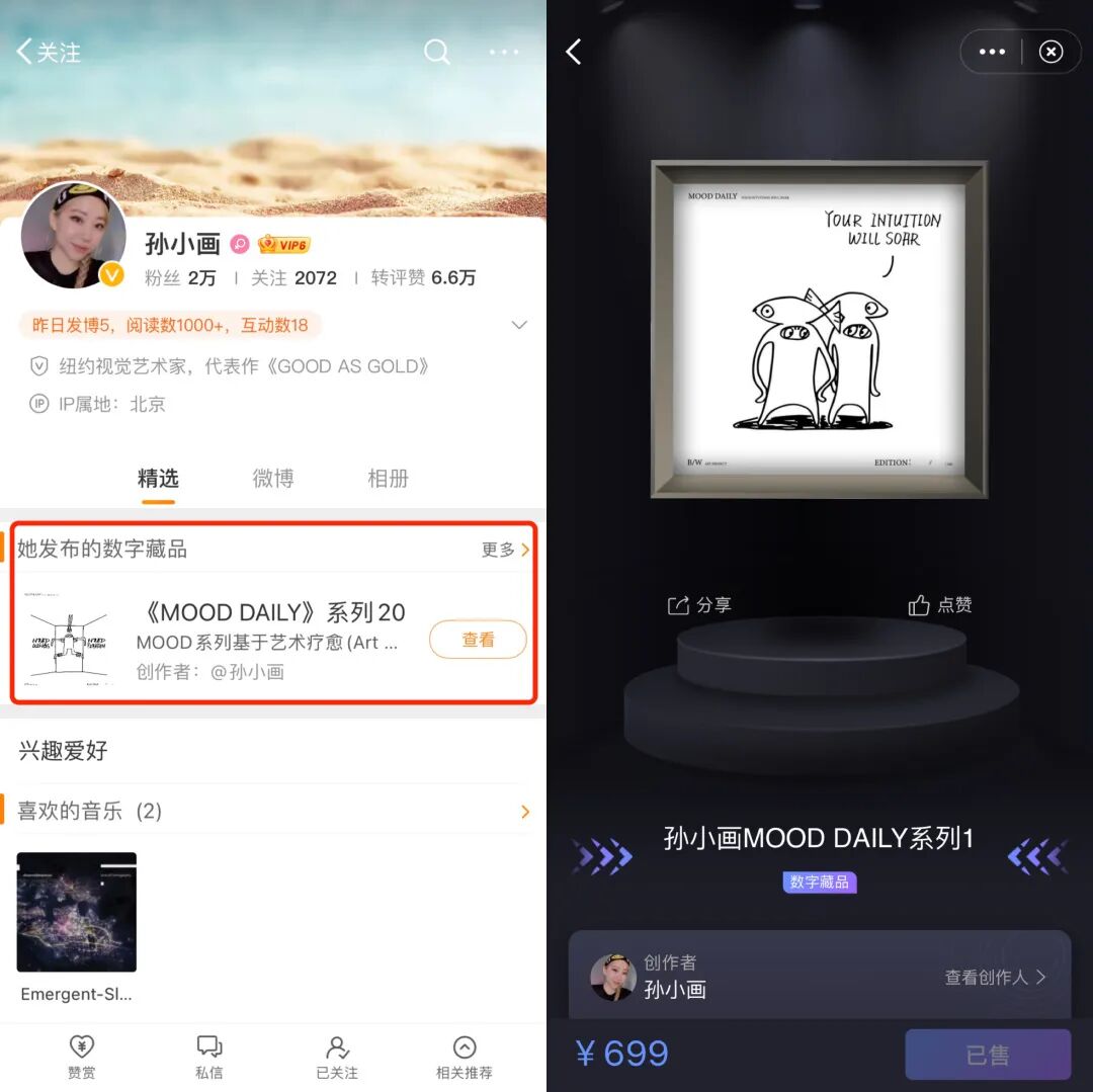自从入驻TopHolder头号藏家以来,@孙小画 表示自己平时喜欢玩微博,作为一个艺术从业人员也对数字藏品也一直很有兴趣,看到TopHolder与微博打通,于是就果断入驻。与此同时,孙小画与我们共同探讨数字藏品相关看法,以及聊一聊了她的系列数字藏品《MOOD DAILY》。