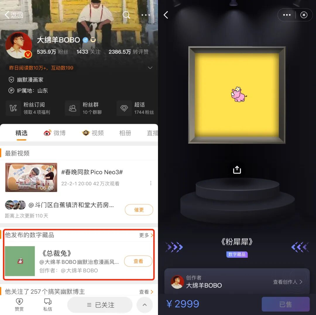 图示:@大绵羊BOBO微博主页&首个数字藏品