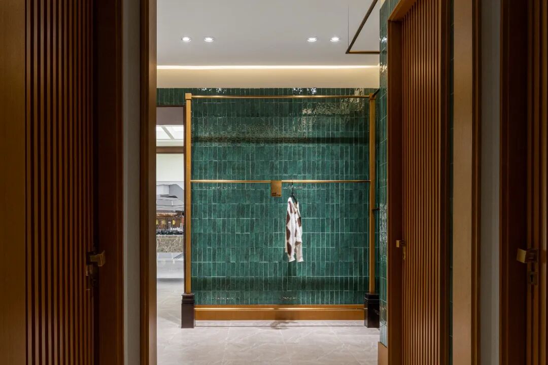 穿过门洞,是一片充满墨绿的内堂,手工砖的斑驳墨绿与前厅的光辉形成质感对比,克制而典雅。环绕四周的定制金属支架,结合了陈列,标识与试衣镜。防锈漆让收银台拥有了犹如手工巧克力般的惊喜质感。具有时间烙印的材质,让这个暗藏了设备间,储藏间与更衣室的功能空间,成为了一个更加精致而典雅的私密空间。