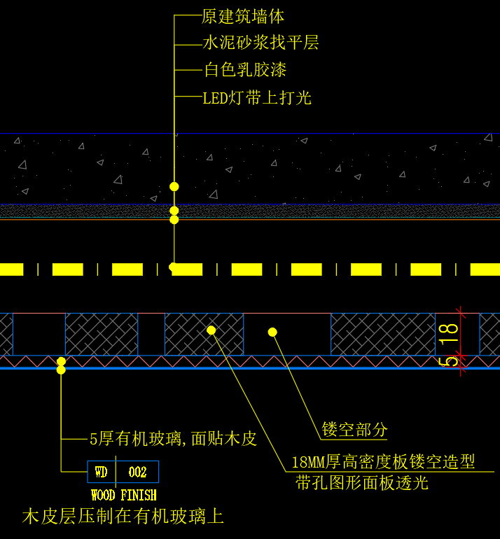 3、第三层是木饰面,可以采用超薄的木饰面,光线穿过第二层镂空的部分,投射到第三层木饰面上呈现的效果就是镂空图案在面层木饰面上发光的效果。