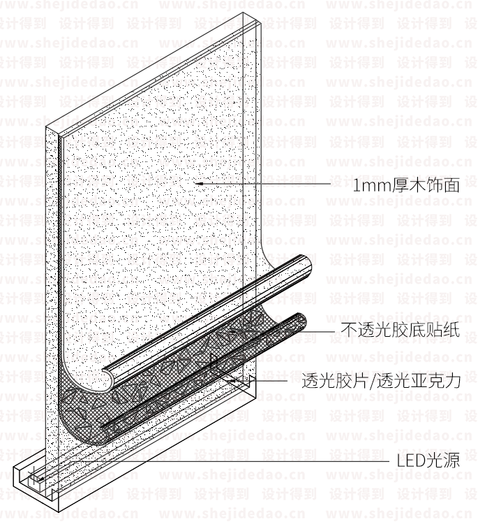 3、第三层是木饰面。既有一定的厚度不至于轻易破损,还能达到透光的效果木饰面,与基层板相结合,也能呈现出木饰面透光的效果。