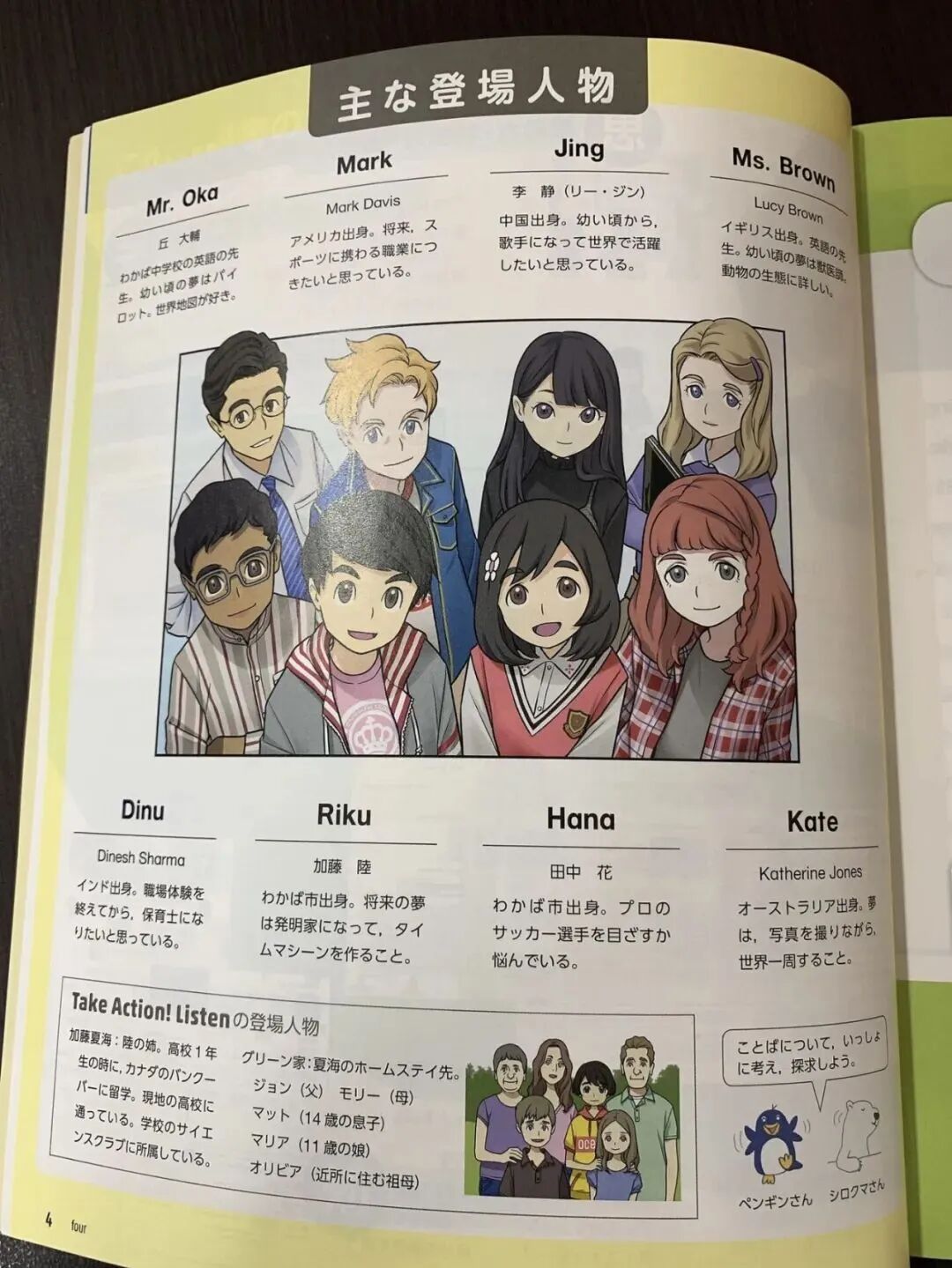 这本叫《NEW CROWN》的英文教材,故事发生在一个叫“若葉市”的地方,主要登场人物从左到右顺序分别是: