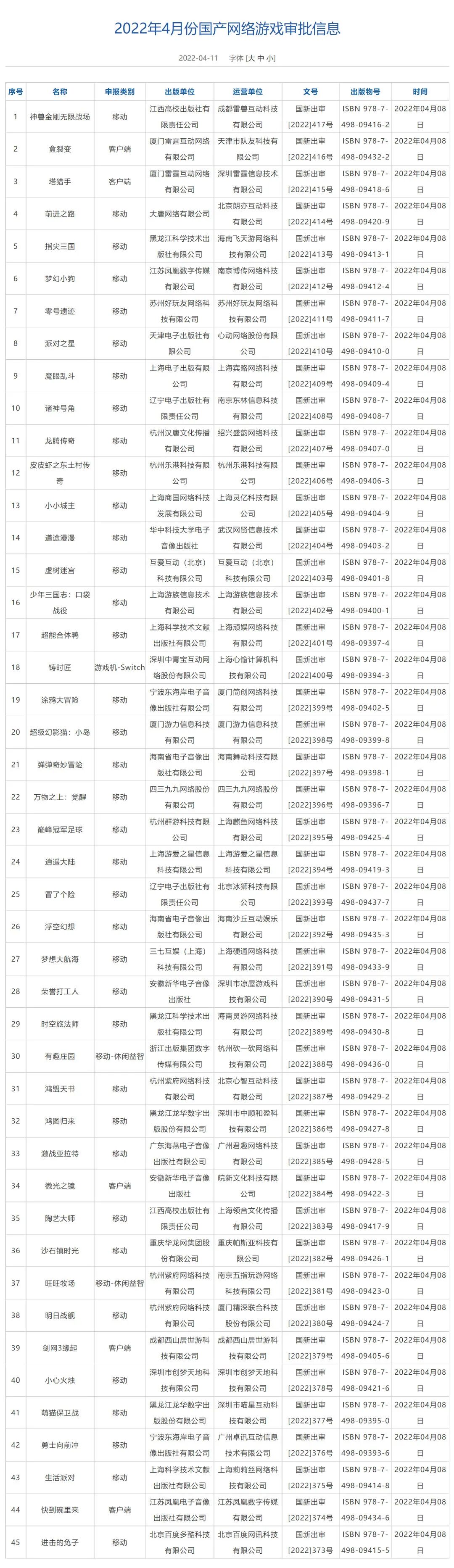 4月11日,国家新闻出版署官网正式公布了2022年4月份的国产网络游戏审批信息。