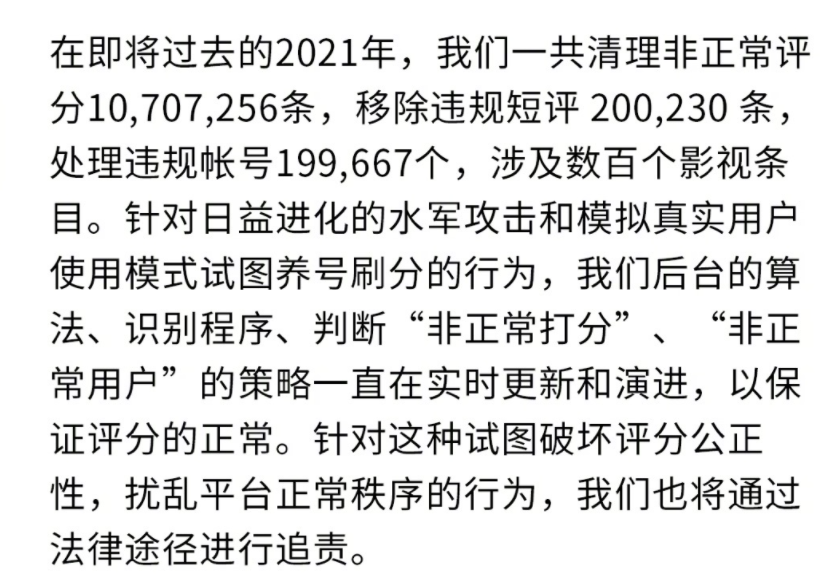 随后,豆瓣平台回应称,2021年全年已有超过1070万条非正常评分。
