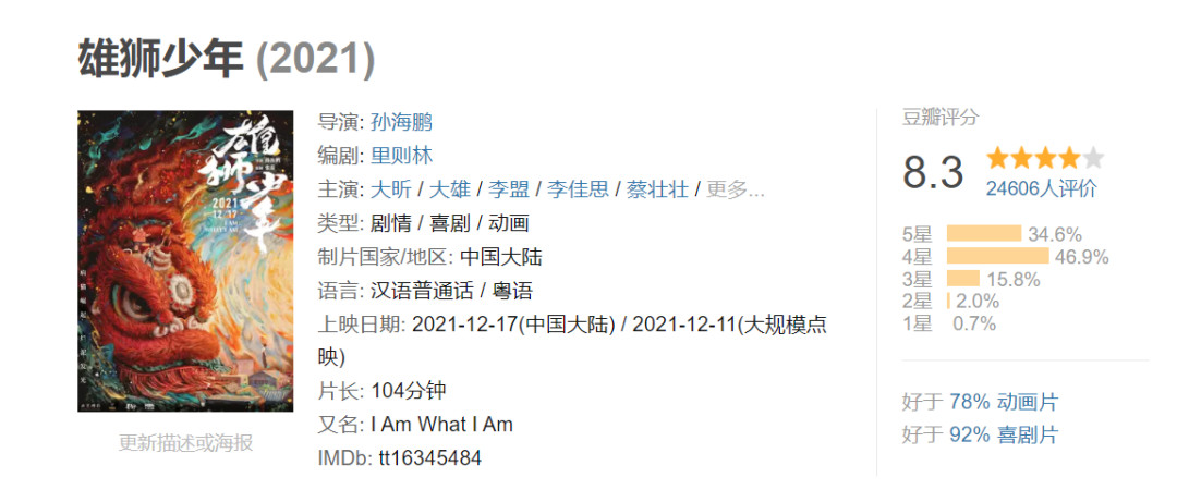 上周五,《雄狮少年》进行了全国公映,好评如潮,目前豆瓣开分就高达8.3分。