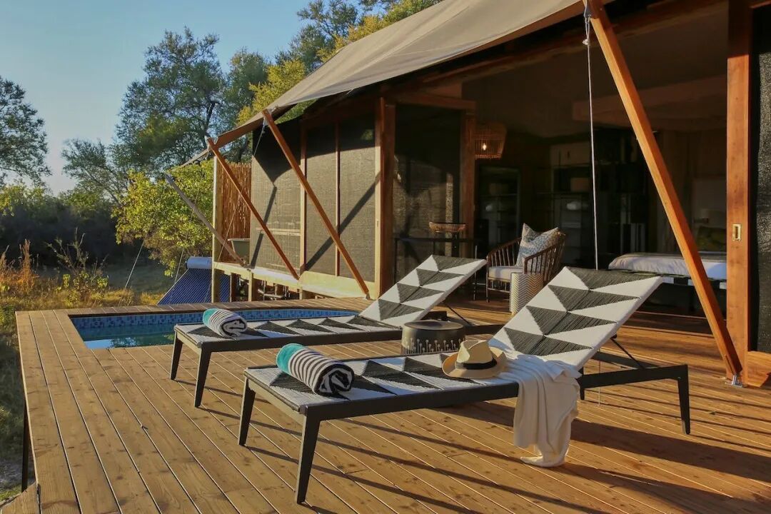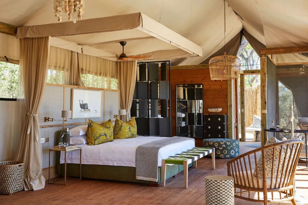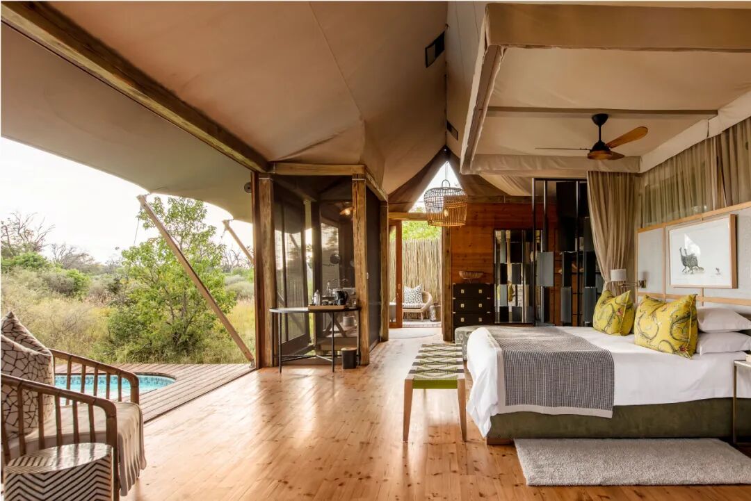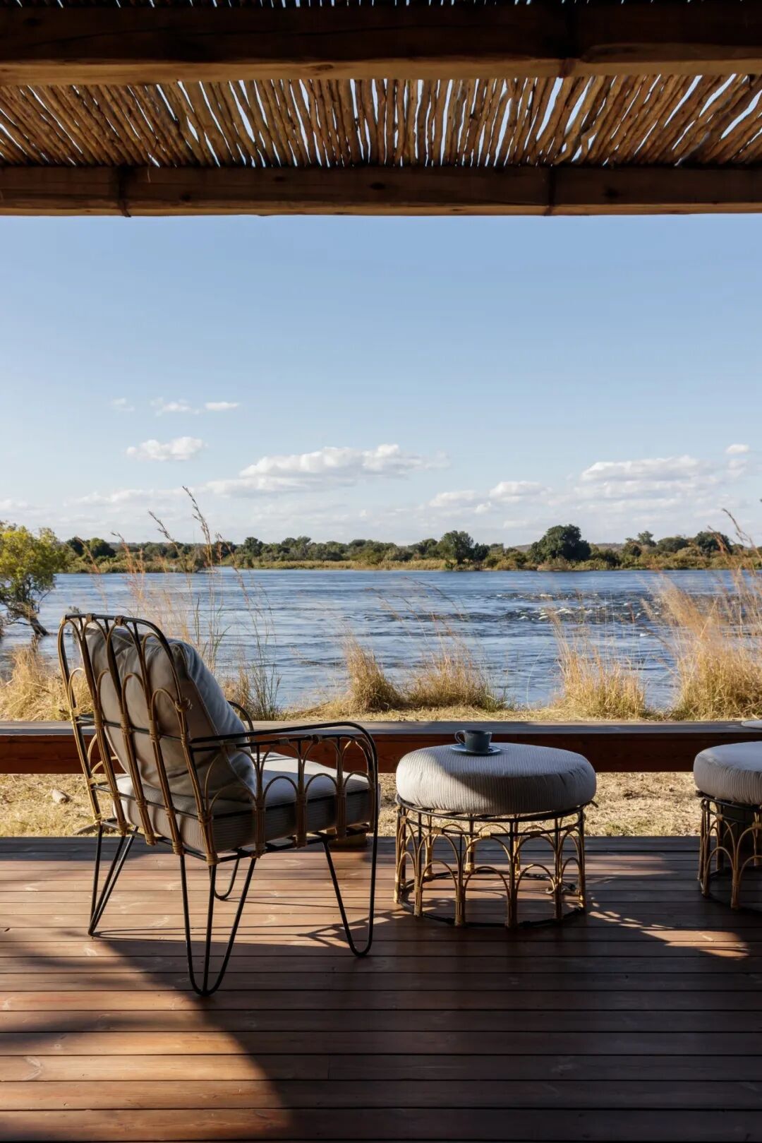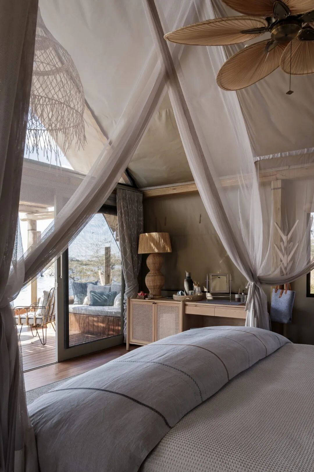 套房均采用沙色、流动的帆布,有顶棚,可欣赏到河边开阔的景色,室内由TracyKelly精心设计装饰。每间套房都有一个带遮阳的阳台区域和连接浴室设施,包括室内淋浴、独立卫生间和双盆。帐篷前的甲板可以看到赞比西河平静平静的流水。