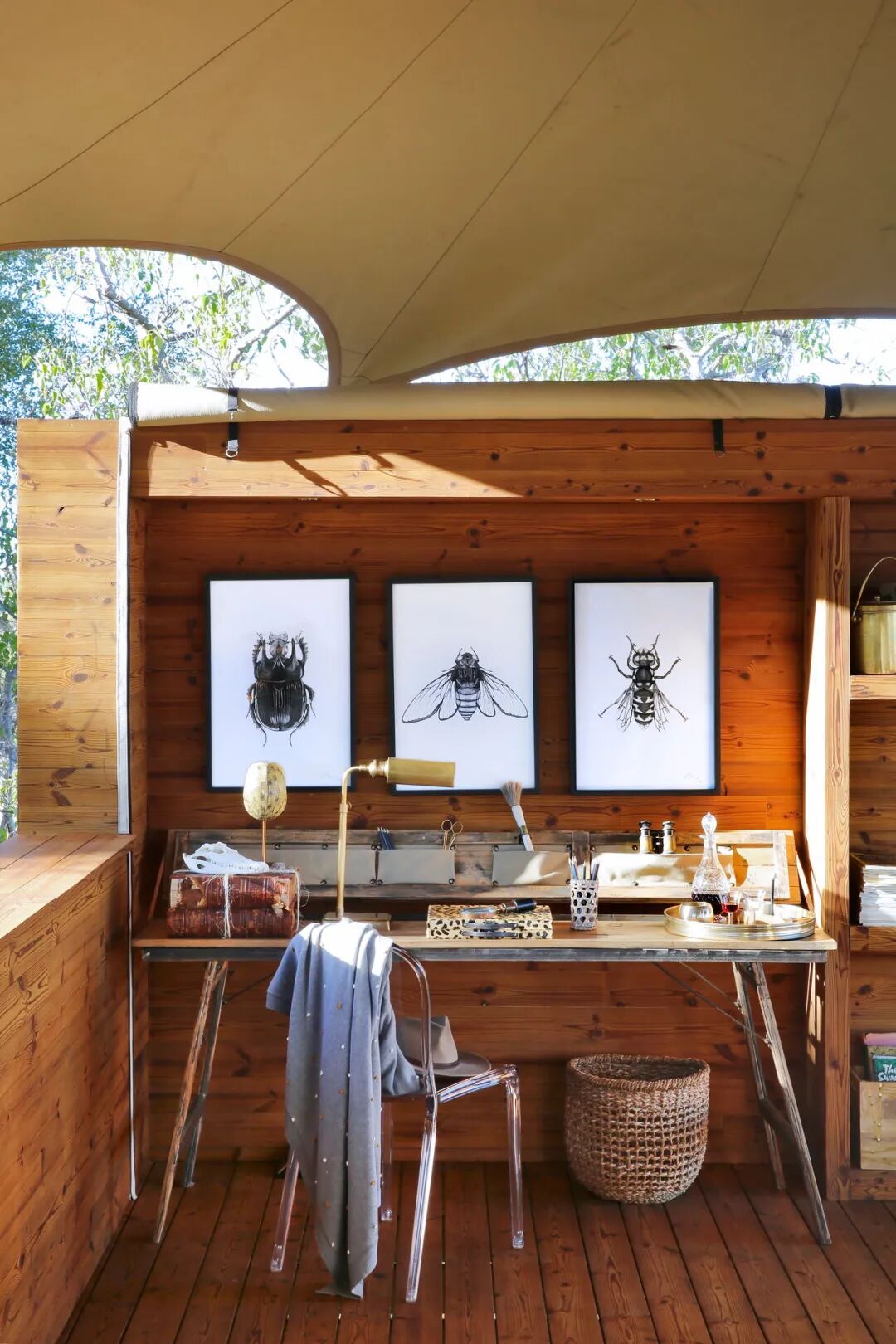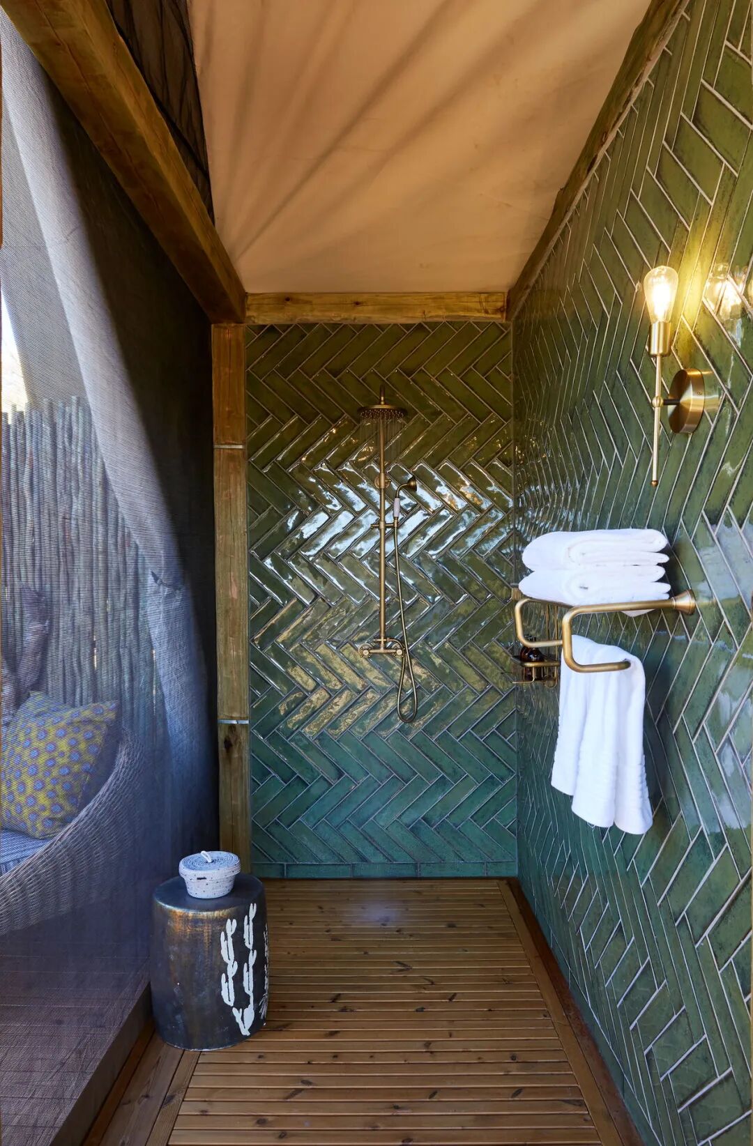 蜿蜒的木质走道通向七个帐篷,这些帐篷在铅树林的阴影下保持凉爽。六间是双人间或双人间,还有一间家庭间,所有房间都配有私人阳台、下沉式休息区和可欣赏河漫滩景色的泼水池。卧室面积均为60平方米,宽敞明亮,通风良好,配有连接浴室、室内和室外淋浴和浴缸。装饰精致,色调温暖。