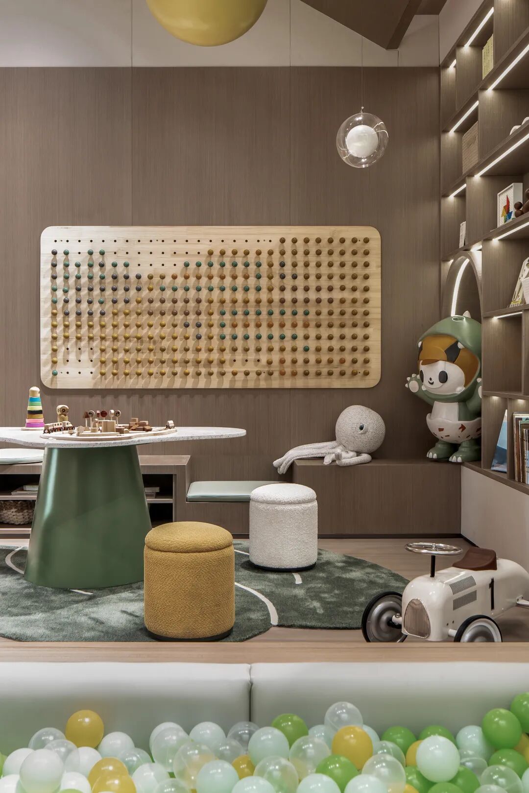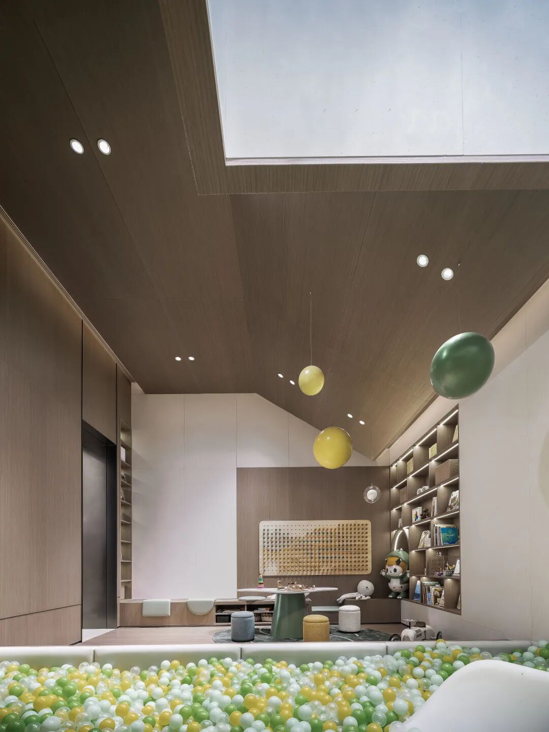 采用温和、柔软的木质感材料营造自然柔和的空间氛围,并以接近大自然的色彩作为空间色彩主调,最大限度地整合童趣区空间的感官和体验感受,使孩子们与参与者一同感受空间自适而包容的气息。
