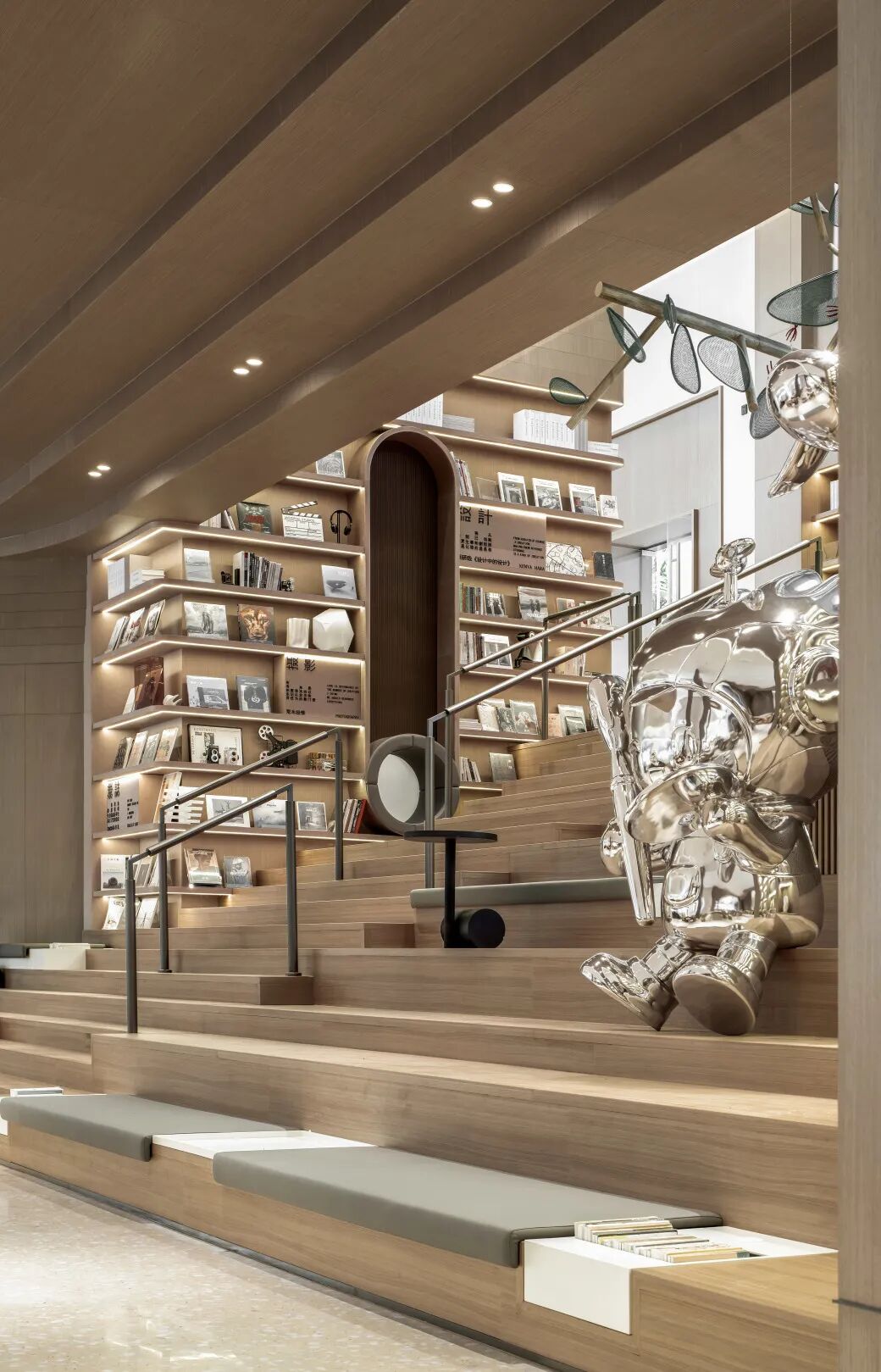 设计希望唤起一种开放感和沉稳感,通过开放式大台阶的设计,将阅读空间的每一个区域有机连接起来,创造出一个具备社交特性的功能岛台。