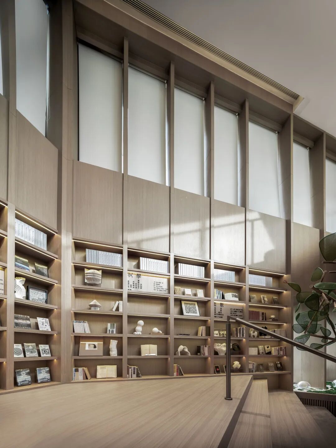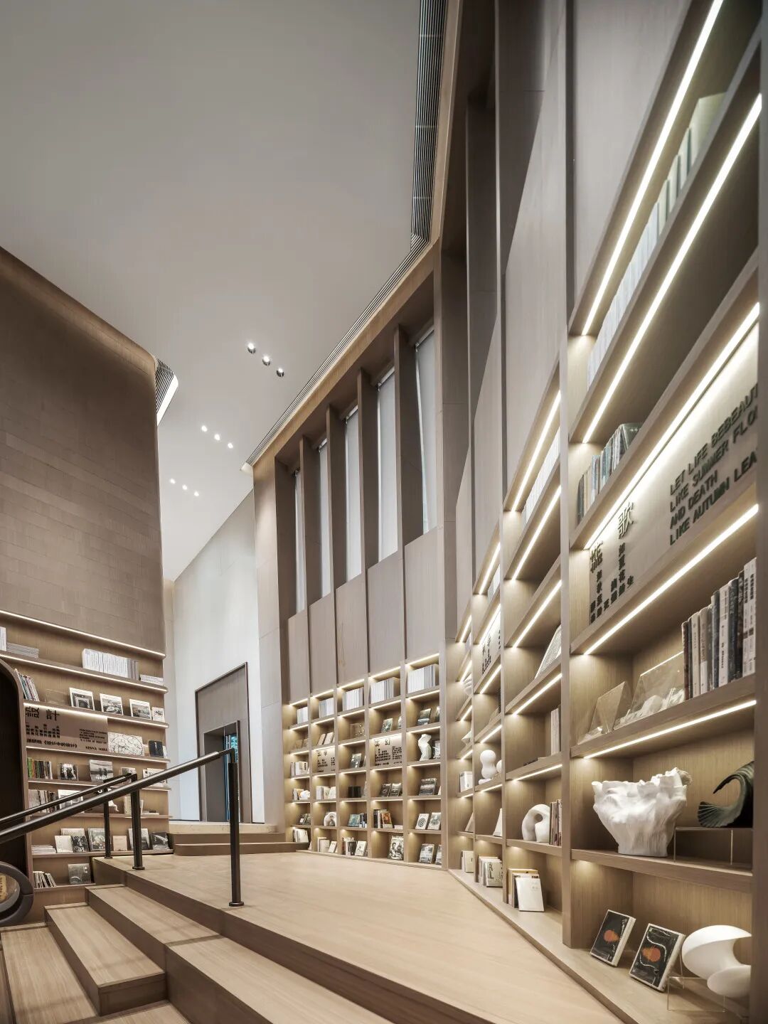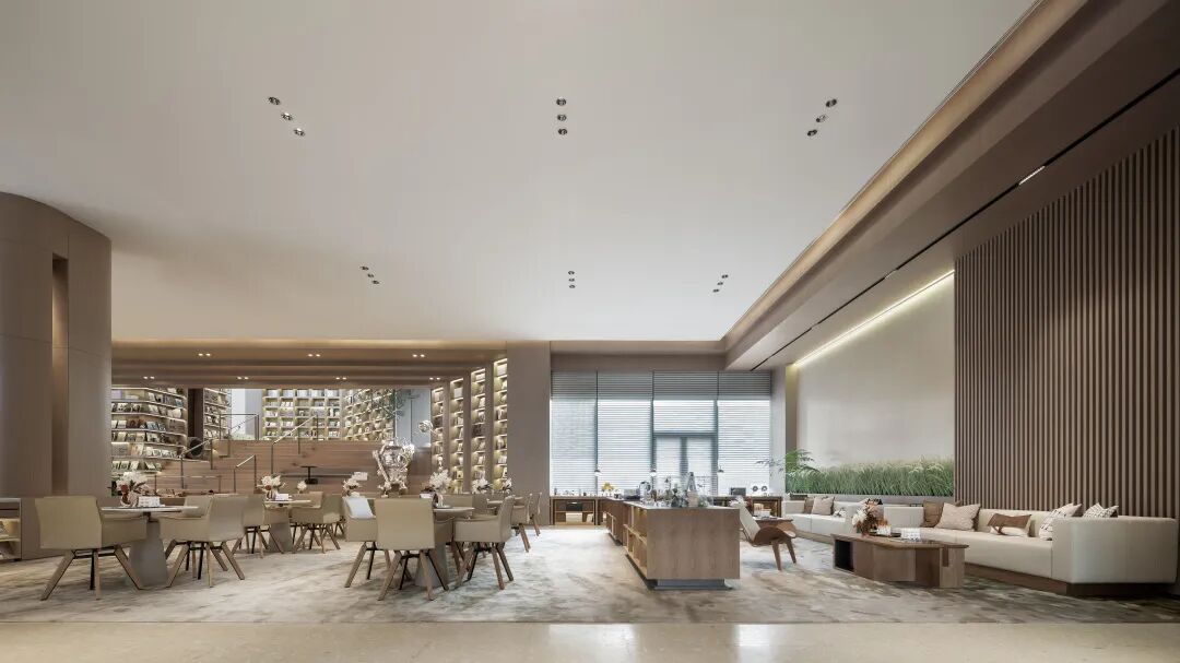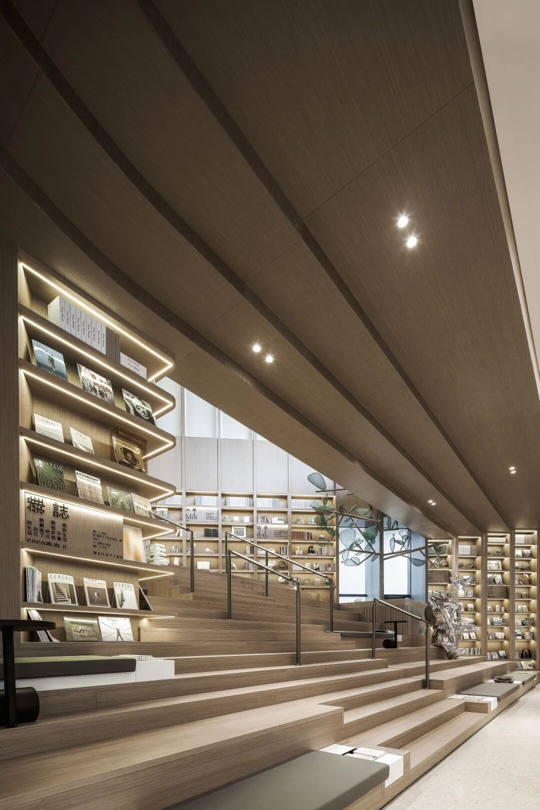 书吧位于整体空间的核心中央区域,巨大的开放式矩形阶梯成为了视觉焦点所在,大面积的线性结合形态令空间形成一种强烈的“剧场式”体验。