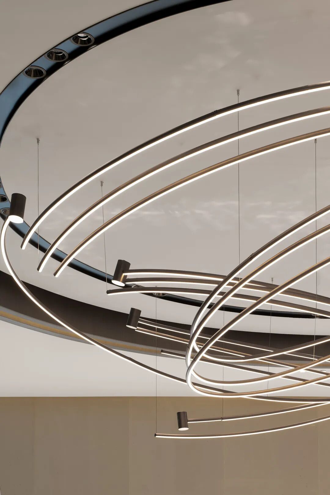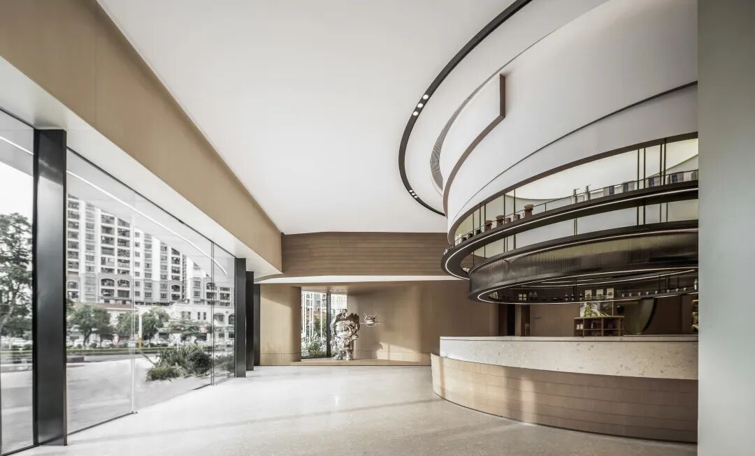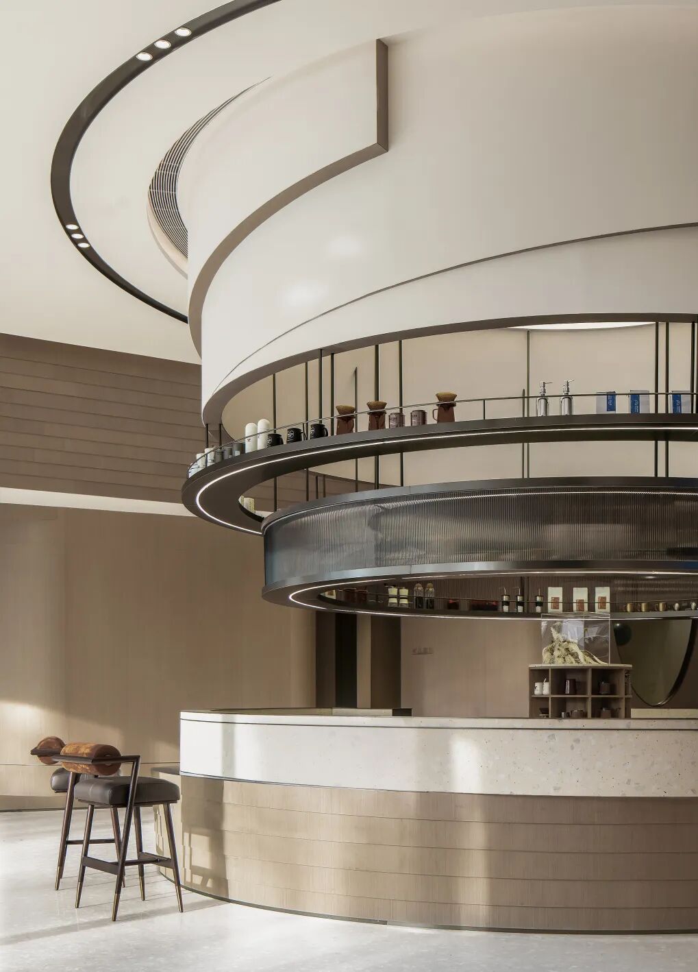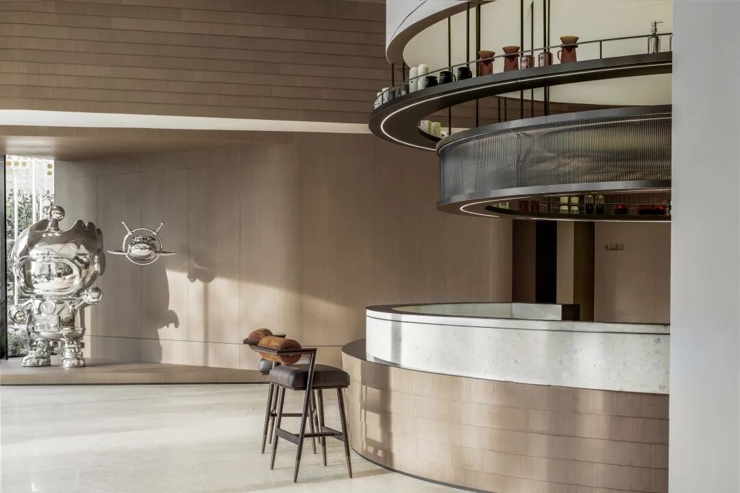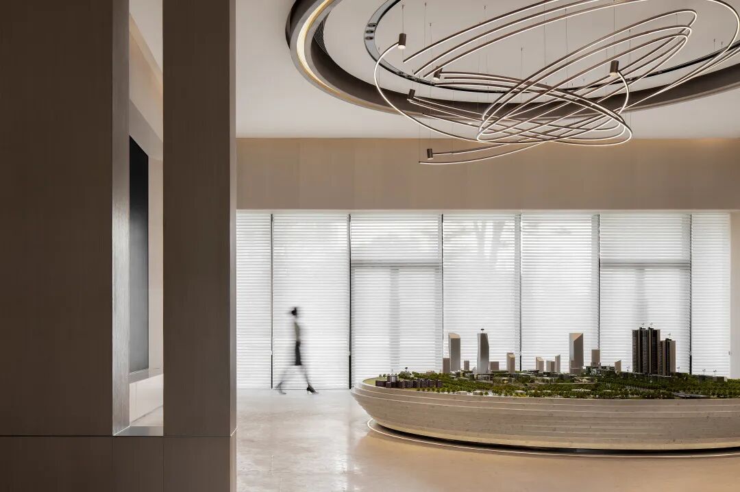 本案中咖啡吧台的设计以一个独具视觉昭示性的圆环形岛台的形象出现在接待前厅处,形成一股不断向上生长的力量,与项目所在的城市及其产业优势所带来的发展核心地位形成一种空间上的共振,也为整个展示空间树立了强烈的形象记忆。