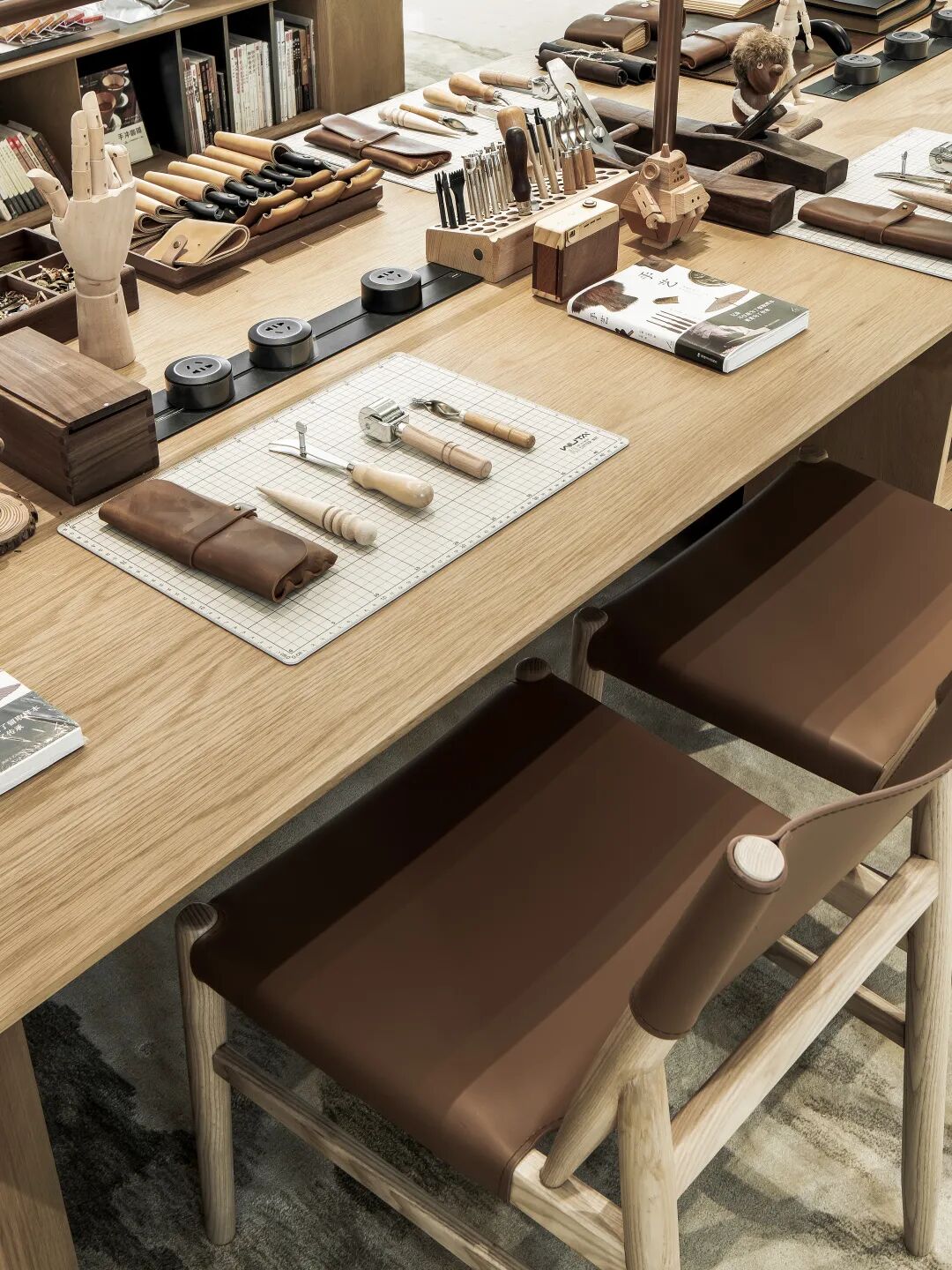 一个空间必须有自己独特的氛围及气质。手作区的设计采用了大地色系作为空间主色调,沉稳温和的色彩令空间变得温暖、柔软。