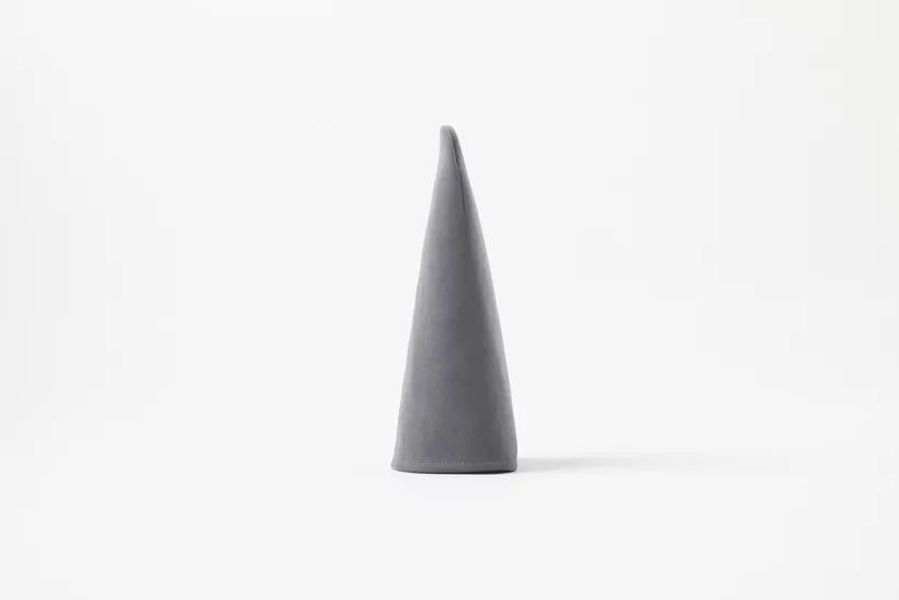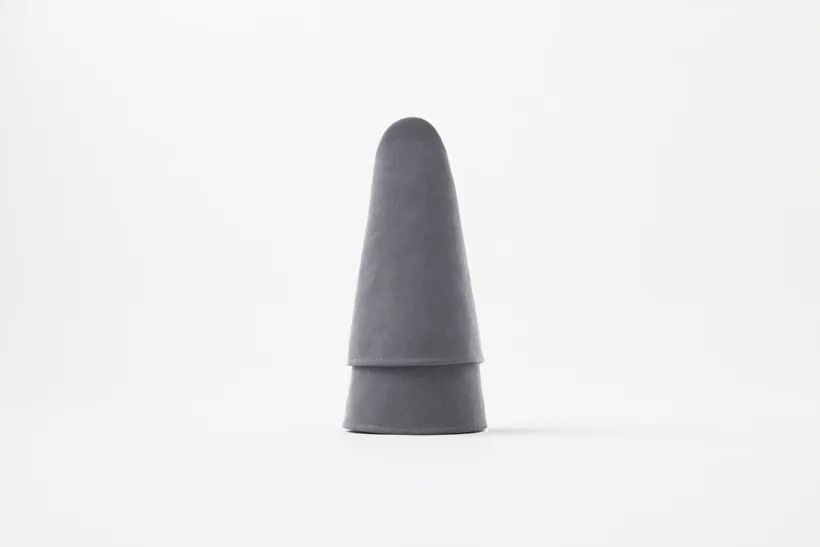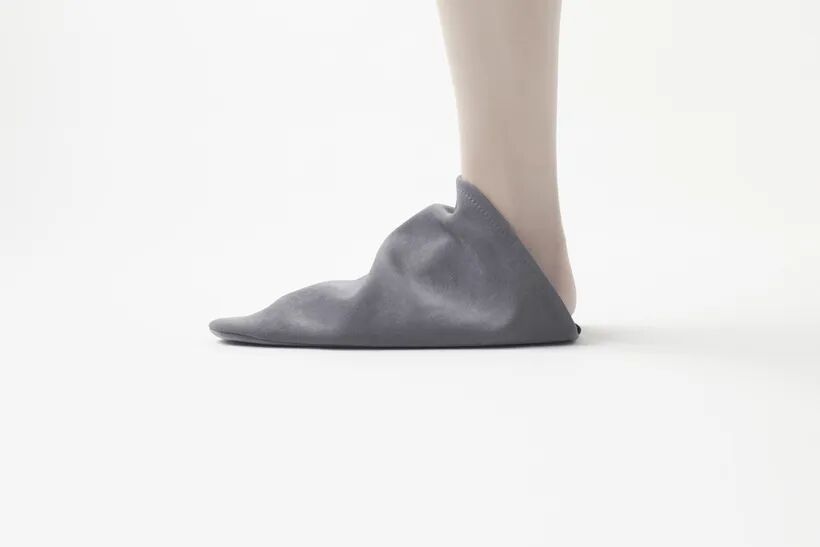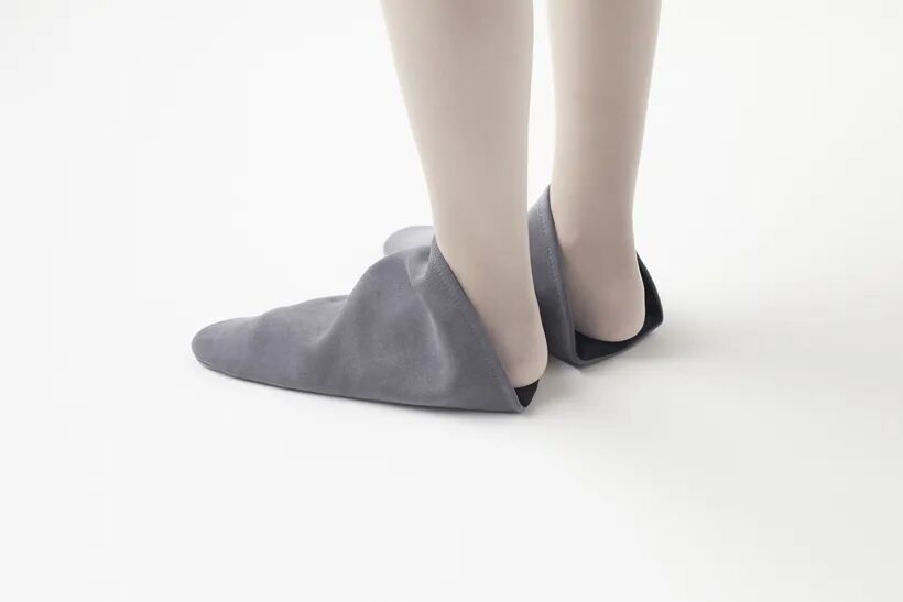A cone-shaped footwear that looks triangular from the side. A natural crease forms in its in-step portion, and it offers a distinctive comfort to your feet unlike any shoes or slippers. It can stand on its own without taking too much space, and several can be stacked up in the foyer with no need for slipper racks. We selected two materials with the following in mind, comfort and steadiness when stood on its own. One being polyester that has elasticity and the other being synthetic leather.