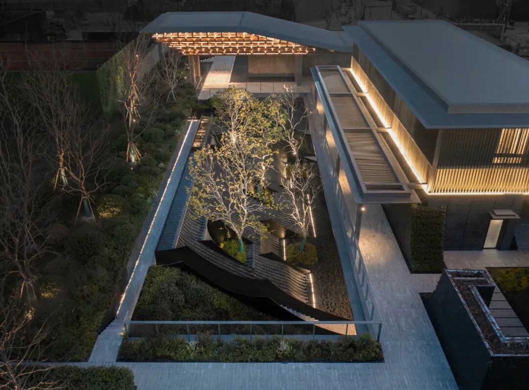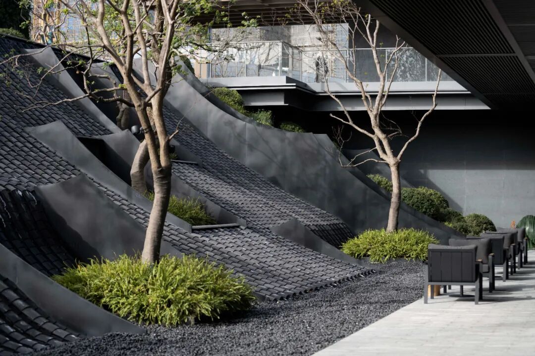 In the design, the eaves, ridges, and waterscape of the water village in Jiangnan are integrated. Walking in it is like walking by the river of the ancient town, and the roof pours onpeople, bringing a cultural atmosphere. The rhythm of space is rhythmic, and the opening and closing relationship of space is formed by using landscape walls, corridors, and plants. From the penetrating view of the space to the grandeur and vitality of the front courtyard, and then to the Zen tranquilityof the sunken courtyard, several spaces form different space atmospheres. Walking along the road, the scenery is different.
