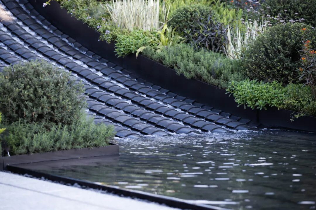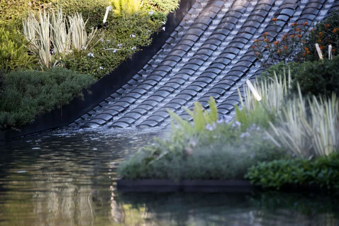 通过研究水乡绍兴,我们获得了很多启示。例如,在灵感方面,如入口到达庭院,我们设计了装置艺术一般的庭院水景,以表现绍兴的历史。我们将绍兴建筑的屋檐和岛屿周围的河流相结合,设计了屋顶落水,既可以供人们避雨,也可以营造出雨打屋檐的效果。该精致的水景装置还可以围合空间,隔离街道的喧嚣,形成私人空间。同时,对于参观者来说,他们看到这道靓丽的风景,也会感到非常自豪。这些都是实体的灵感。