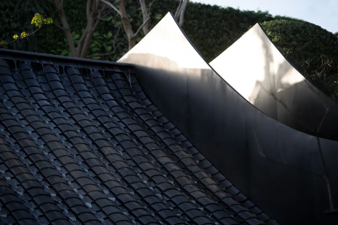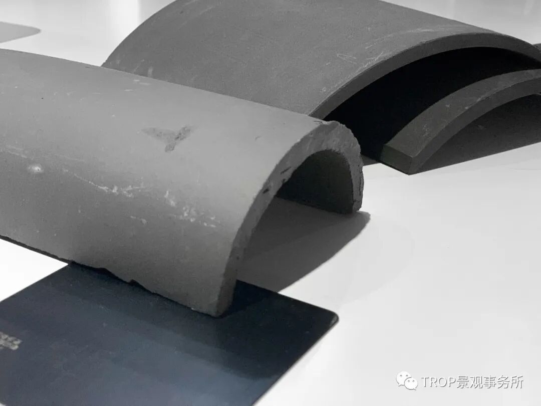 金属的视角,少量金属的加入,是为了增加肌理对比的艺术化冲突。这也是“新”与“旧”的一种隐喻,瓦片粗糙又亲近,就像江浙地区小时候生活的环境;钢板精致冷酷,规定了路径和树坑的位置,严肃有纪律,就像现代社会的信息文明。