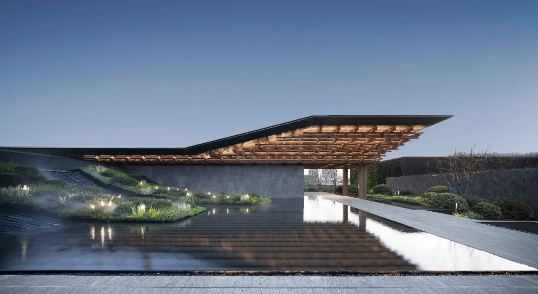 江南水乡滨水而居,设计中将水乡中的屋檐、屋脊、水景融为一体,行走其中,仿佛走在古镇河边,屋顶向人扑面而来,带来文化的氛围。空间节奏抑扬顿挫,利用景墙、廊道和植物形成空间的开合关系。从到达空间的透景,到前场庭院的宏大与生机,再到下沉庭院的禅意静谧,几进空间形成不同的空间氛围,沿路走进,步移景异。
