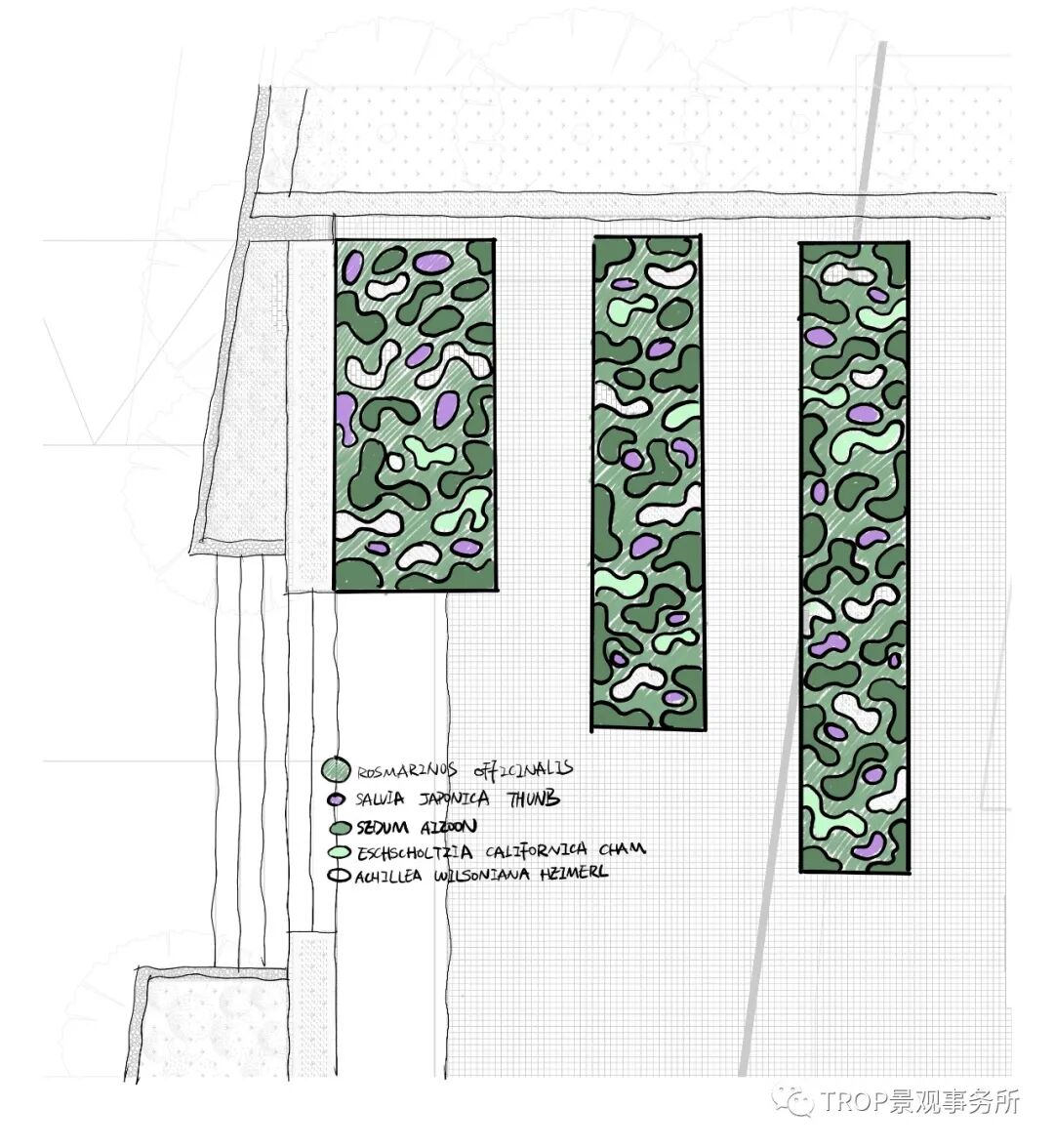 和砖一样,植物也是构成空间的媒介。植物设计上,设计师想把地理记忆和空间构造做一次大胆的拼接尝试。每一株植物就是一块砖。植物会不停的把“砖”一块块垒上去,从而实现自身的生长。基于绍兴本地的植物氛围和性状,我们与施工图合作方魏玛共同尝试着选出几种当地植物,作为植物造景的“单元砖”,并在平面上排列出砖砌设计的组合结构。