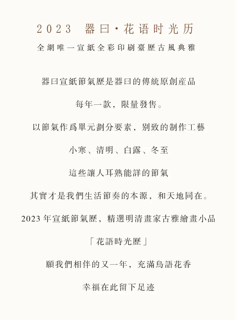 捧读日历,时光的日日流转,一幅幅气韵生动的画作悠悠现于您眼前,古人的精神思想随之照进我们的生活,充实我们的内心世界。午后闲暇时光,无论在家中,还是学校、办公室,一盏茶,一卷书,日历伴您左右,日日都是好时节。