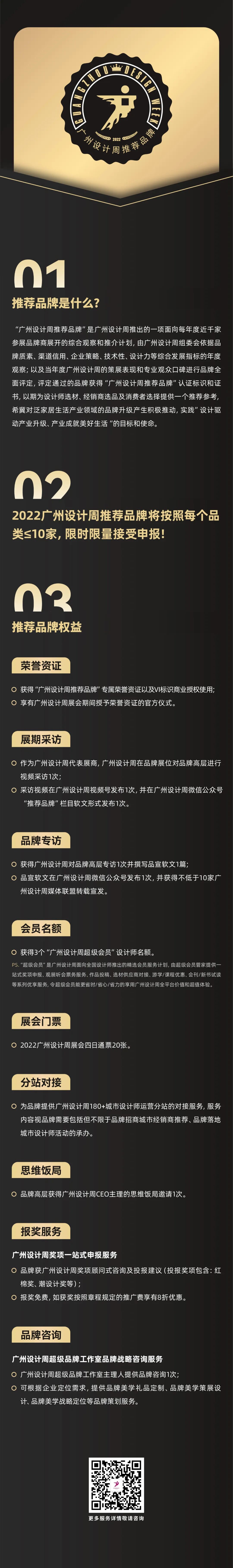“推荐品牌”是广州设计周推出的一项面向每年度近千家参展品牌商展开的综合观察和推介计划,由广州设计周组委会依据品牌质素、渠道信用、企业策略、技术性、设计力等综合发展指标的年度观察;以及当年度广州设计周的策展表现和专业观众口碑进行品牌全面评定,评定通过的品牌获得“广州设计周推荐品牌”认证标识和证书。以期为设计师选材、经销商选品及消费者选择提供一个推荐参考,希冀对泛家居生活产业领域的品牌升级产生积极推动,实践”设计驱动产业升级、产业成就美好生活“的目标和使命。