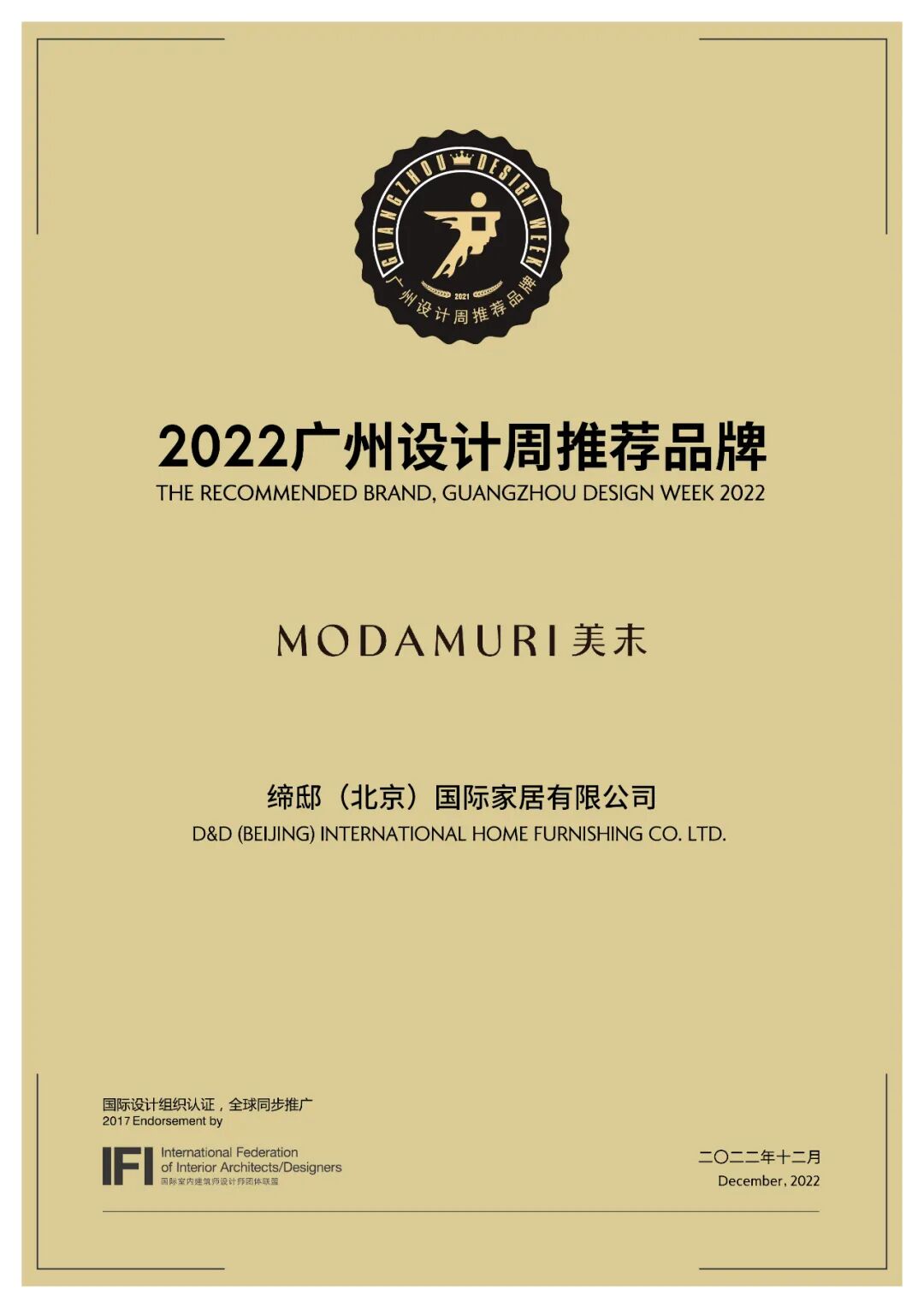 “推荐品牌”是广州设计周推出的一项面向每年度近千家参展品牌商展开的综合观察和推介计划,由广州设计周组委会依据品牌质素、渠道信用、企业策略、技术性、设计力等综合发展指标的年度观察;以及当年度广州设计周的策展表现和专业观众口碑进行品牌全面评定,评定通过的品牌获得“广州设计周推荐品牌”认证标识和证书。以期为设计师选材、经销商选品及消费者选择提供一个推荐参考,希冀对泛家居生活产业领域的品牌升级产生积极推动,实践”设计驱动产业升级、产业成就美好生活“的目标和使命。