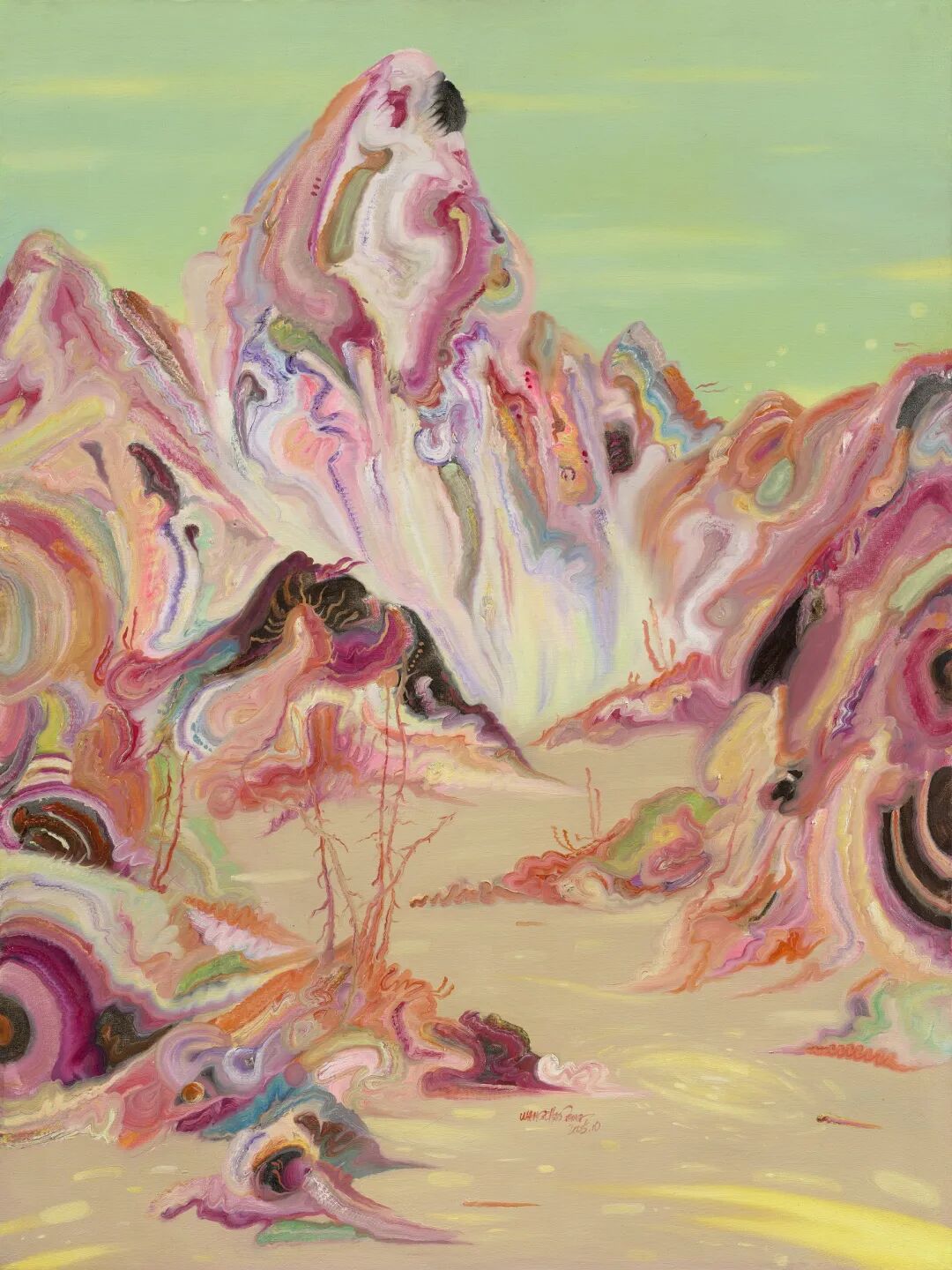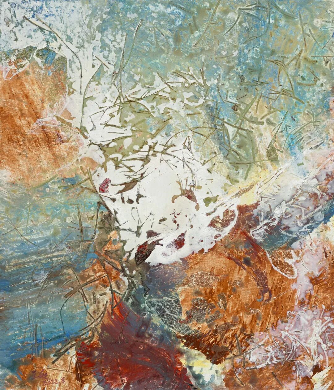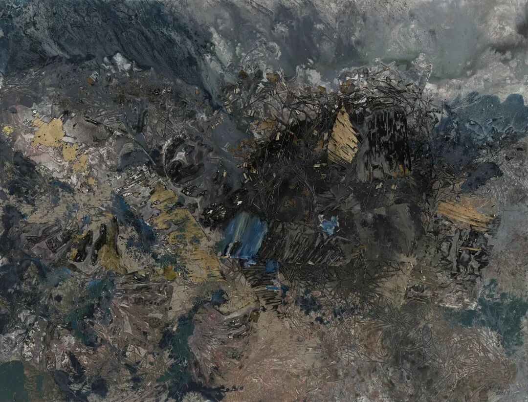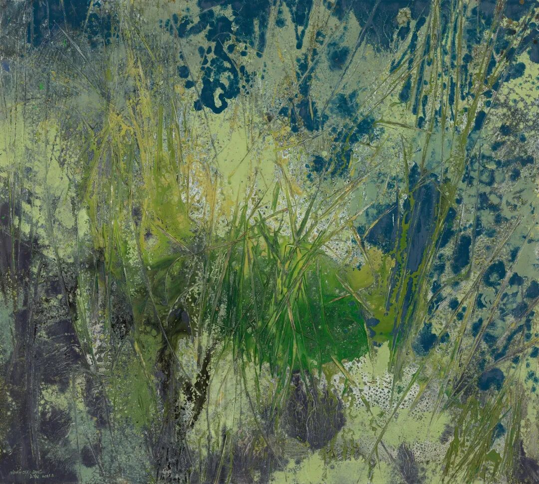 近期新作《秘境》系列则在创作方法上发生了跳跃性的变化,采用植物肌理拓印、综合材料创作的形式构建更加斑斓绚丽的神秘境地,将对景的中国式演绎拉回到现实的映照。那些不同形状、大小的叶片所拓印的斑驳印记依稀可辨,空气弥漫其间,光斑闪烁迷离,枯草和枝叶还残留期间,演变为“有生命力”的色彩和笔触,丙烯、油画颜料泼洒流淌于画布。秘境系列制造的迷幻视觉和蛮横强劲突破了传统文人式的内敛和婉转,让血脉更加沸腾,充满时代精神的张力。