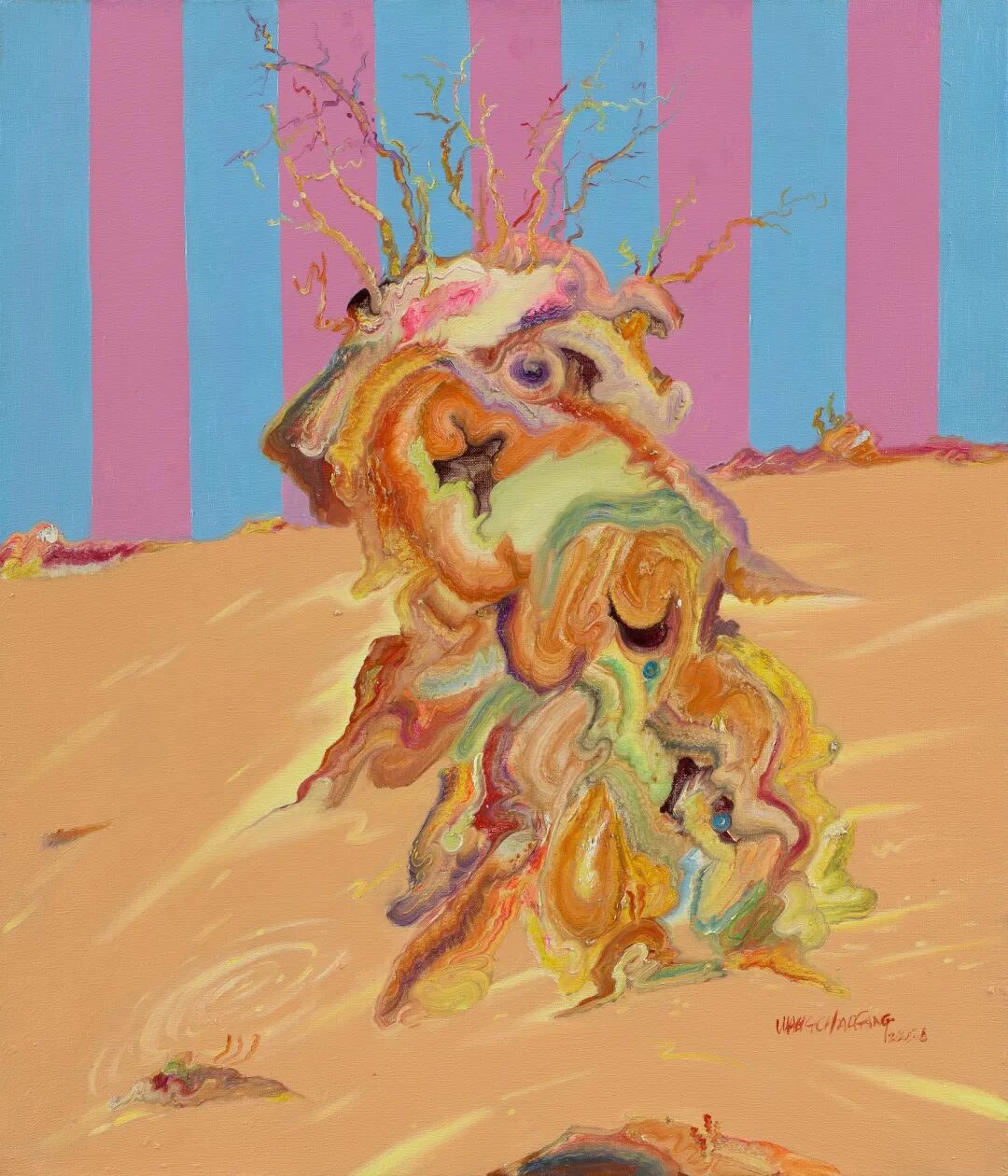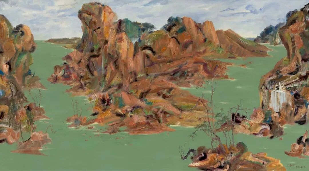 艺术家王朝刚的作品极具戏剧性,具有现实与荒诞、异质与奇幻等多重特征。他以绘画本体语言为切口,用荒诞诙谐的手法,将传统山水、花鸟等图式以律动的笔触和色彩的并列、分割、重组,同时将蜥蜴、神兽等动物置于现实的花盆里或虚拟的舞台上,把中国传统的精神性力量,融汇到当代的视觉理念中,展现出一幅幅绚丽斑斓、抽象荒诞的现实镜像,一幕幕揭示生活本质的悖论情境,从而构筑起一个个与众不同的“言说空间”,表达其自身对当下社会的追问与反思。