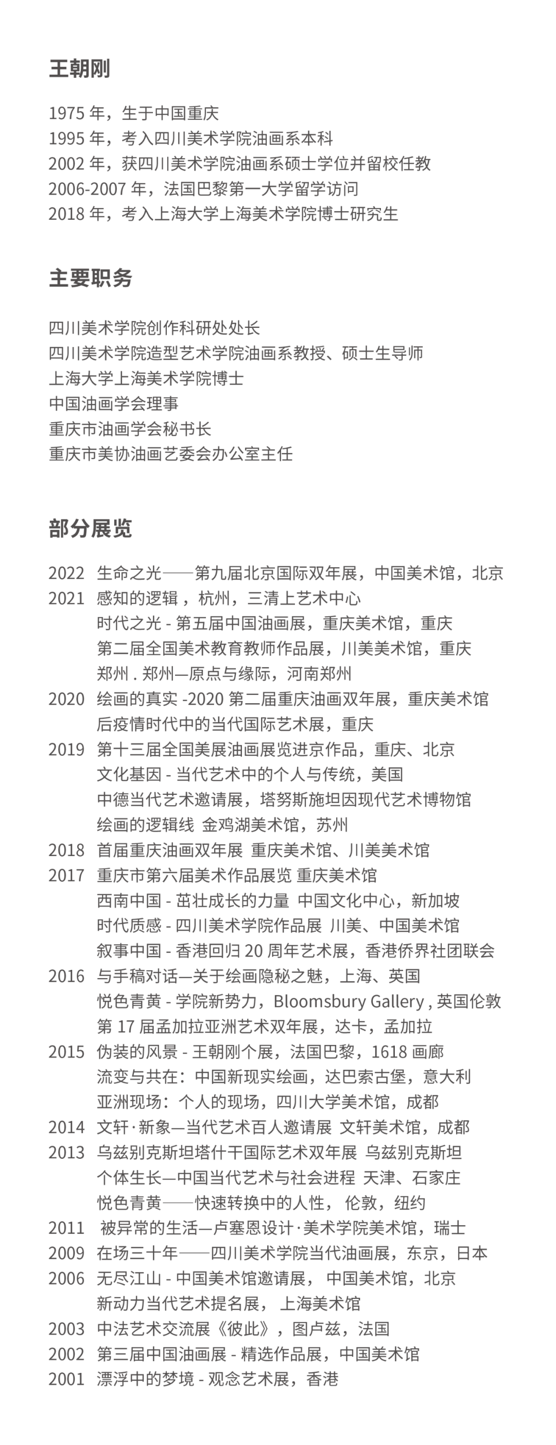 王朝刚,1975年出生于中国重庆,1995年考入四川美术学院油画系本科,1999年考入四川美术学院油画系研究生,2002年获四川美术学院油画系硕士学位并留校任教,2006-2007年,前往法国巴黎第一大学留学访问,2018年考入上海大学上海美术学院博士研究生。现任四川美术学院创作科研处处长、教授、硕士生导师、中国油画学会理事、重庆市油画学会秘书长、重庆市美协油画艺委会办公室主任。作品被中国美术馆、成都市美术馆、四川美术学院、南京有润美术馆、恒大集团等多家机构、企业和私人收藏。