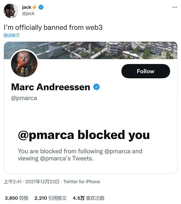 12月23日,一场关于web3.0的论战迎来了一个戏剧性的落幕,web3.0反对者中的代表人物、推特创始人Jack Dorsey被web3.0封杀。这场论战的源于Dorsey于21日发布了一条推文,批评 Web3.0 是风险投资公司的工具。随后马斯克也加入了批评Web3.0的行列,指责Web3.0只是一种营销方式。a16z创始人Marc Andreessen等支持者则纷纷回应反驳。