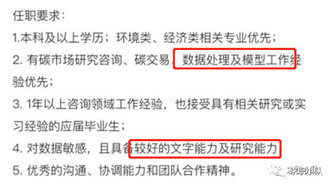 通常需要商科或环境类(环境经济等)背景的候选人,要求数据分析与建模能力,部分类型的公司如交易所,还需要候选人具备“将英语作为工作语言”的能力。